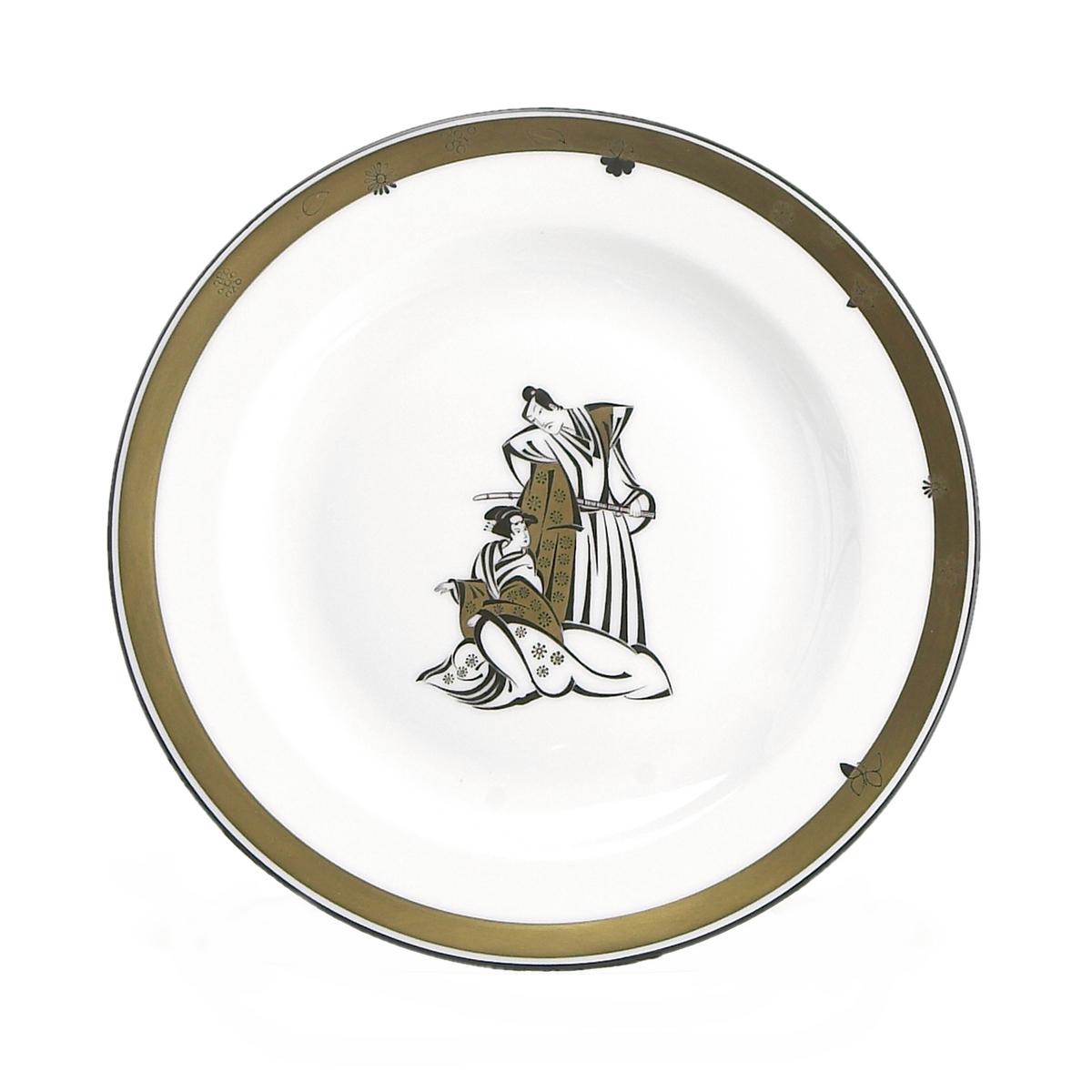 Japanese art meets Hungarian porcelain. Herend presents this delightful combination with aristocratic charm in its "Kimono" porcelain dinner service, the design is the result of intricate hand-painted calligraphy. The images were inspired by Japanese motifs, some of which the Herend porcelain artists have arranged asymmetrically. Samurais, women combing their hair, or couples in kimonos stand opposite the silhouette of a tree, while birds and dragons flutter around the rim.
