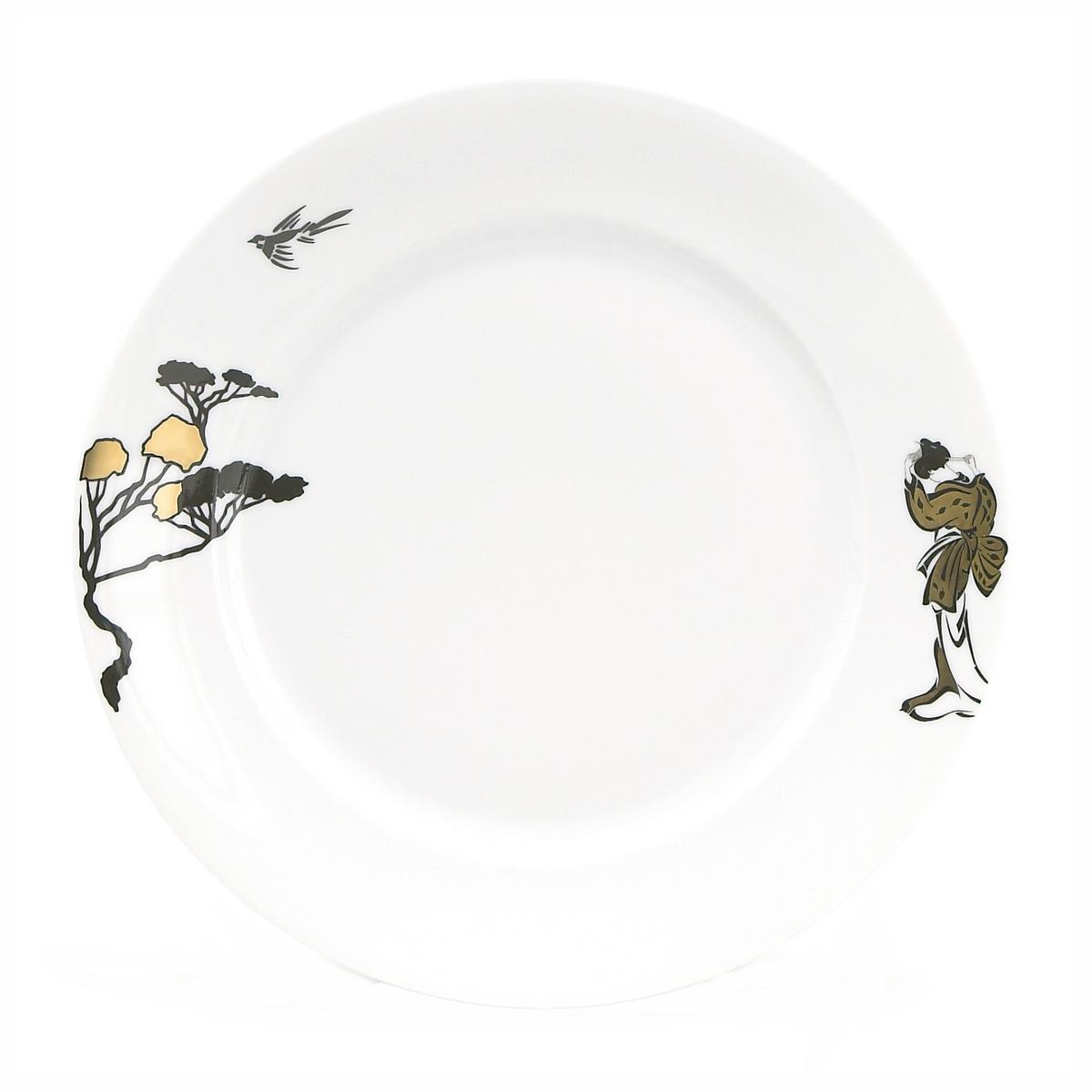 Japanese art meets Hungarian porcelain. Herend presents this delightful combination with aristocratic charm in its "Kimono" porcelain dinner service, the design is the result of intricate hand-painted calligraphy. The images were inspired by Japanese motifs, some of which the Herend porcelain artists have arranged asymmetrically. Samurais, women combing their hair, or couples in kimonos stand opposite the silhouette of a tree, while birds and dragons flutter around the rim.