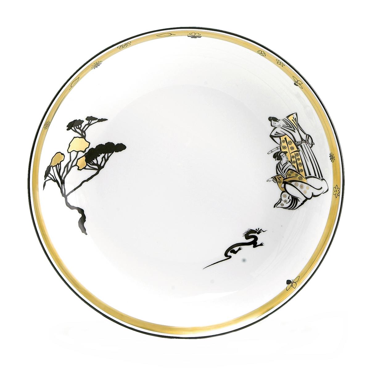 Japanese art meets Hungarian porcelain. Herend presents this delightful combination with aristocratic charm in its "Kimono" porcelain dinner service, the design is the result of intricate hand-painted calligraphy. The images were inspired by Japanese motifs, some of which the Herend porcelain artists have arranged asymmetrically. Samurais, women combing their hair, or couples in kimonos stand opposite the silhouette of a tree, while birds and dragons flutter around the rim.