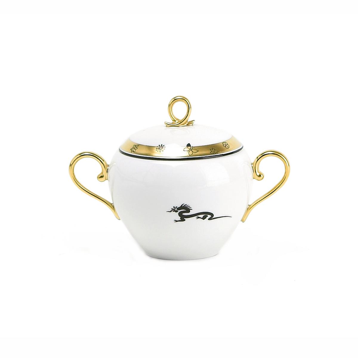 "Kimono" strictly adheres to a gold and black colour scheme. The handles of the cups are gilded and the gold rims of the plates and cups are adorned with black leaves, petals and butterflies. The hand-painted "Kimono" dinner service from the respected Hungarian manufacturer Herend displays a fascinating mixture of Japanese minimalism in partially gilded apparel.