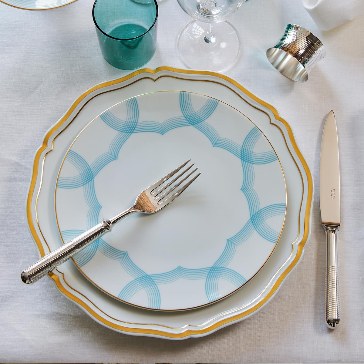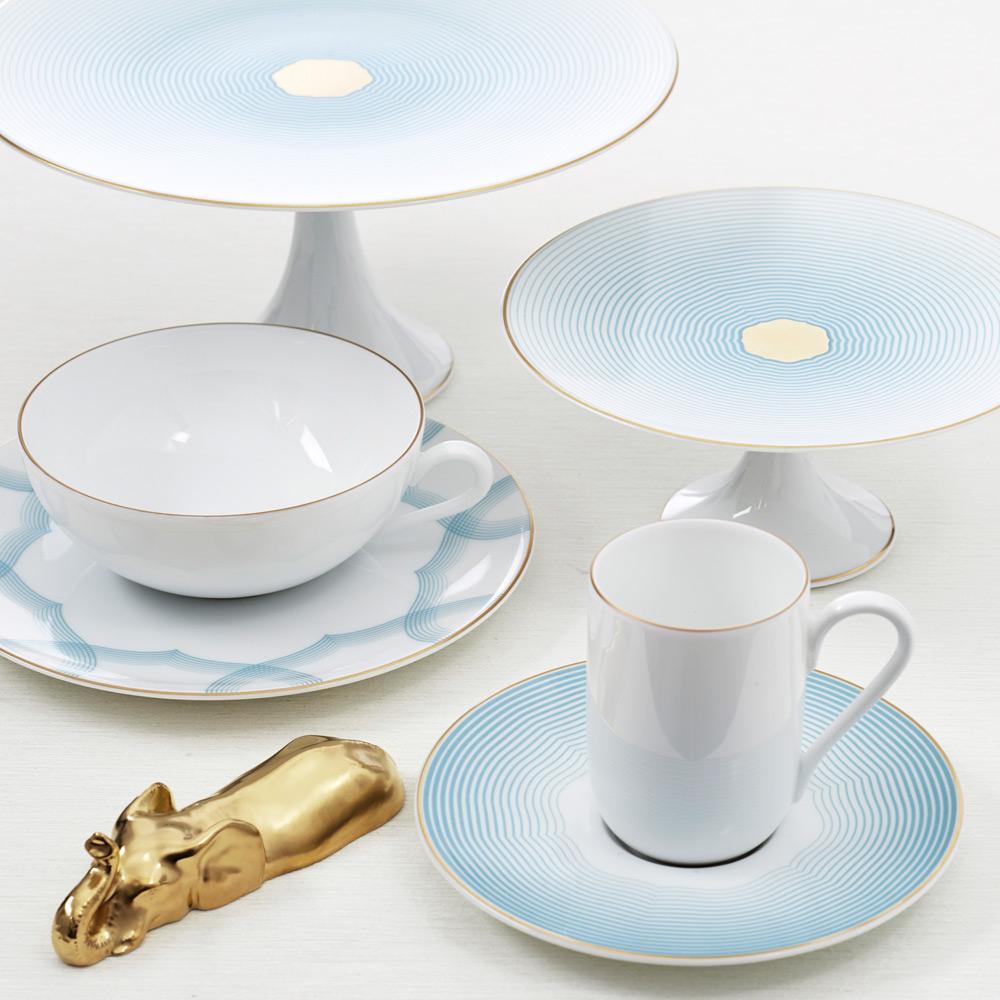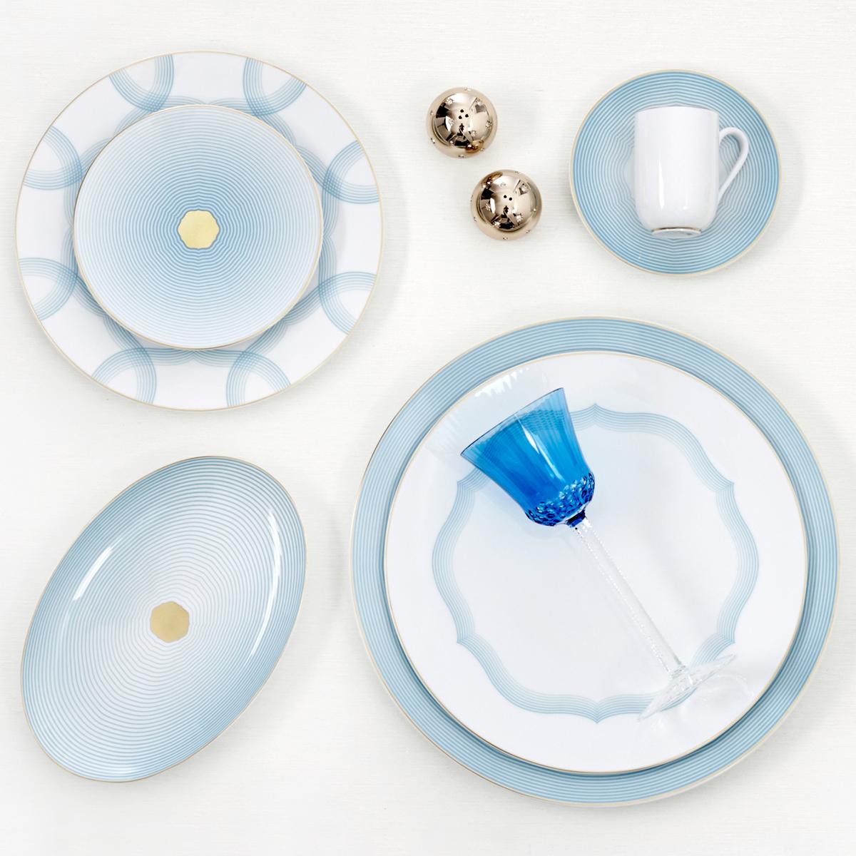 Based on the typical scalloped decor of the 18th century Raynaud developed the graphic and modern "Aura" dinner service. The curved lines decorate the fine Limoges porcelain plates and cups in a different way.