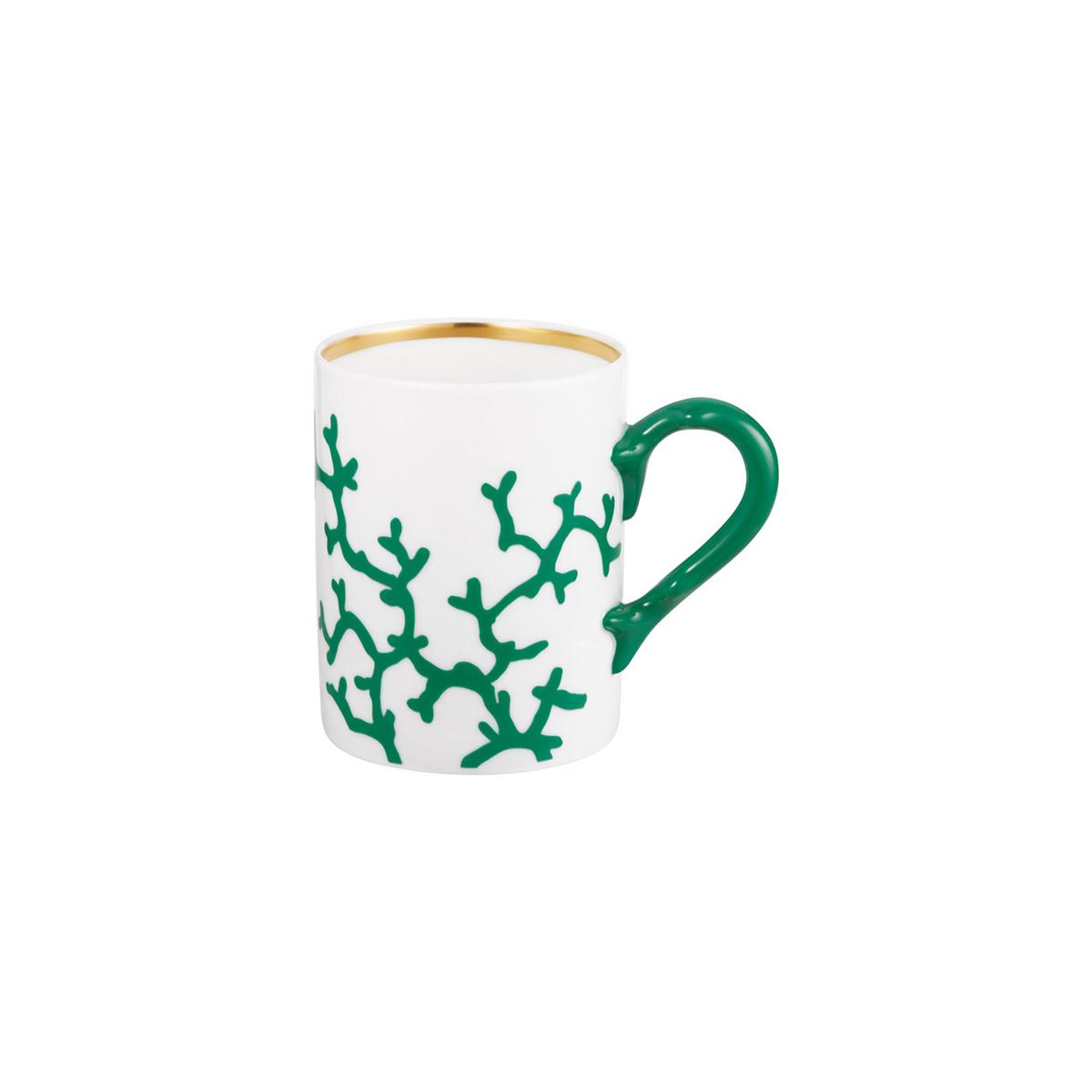 The emerald green color, which complements the original coral red collection ("Cristobal Coral") and the ultramarine blue version ("Cristobal Marine"), plunges un into the abyss and the mysterious sea pits. It is sometimes dense and deep on the coral handles of the cups or on the knobs of the teapots, sometimes soft, contrasting, nuanced and watercoloured on the plates decorated with coral motifs in harmonious shapes. Displayed in small touches on the table or staged in an opulent way, Cristobal composes, builds and invents infinitely with the elegance and generosity that characterize the talented decorator.