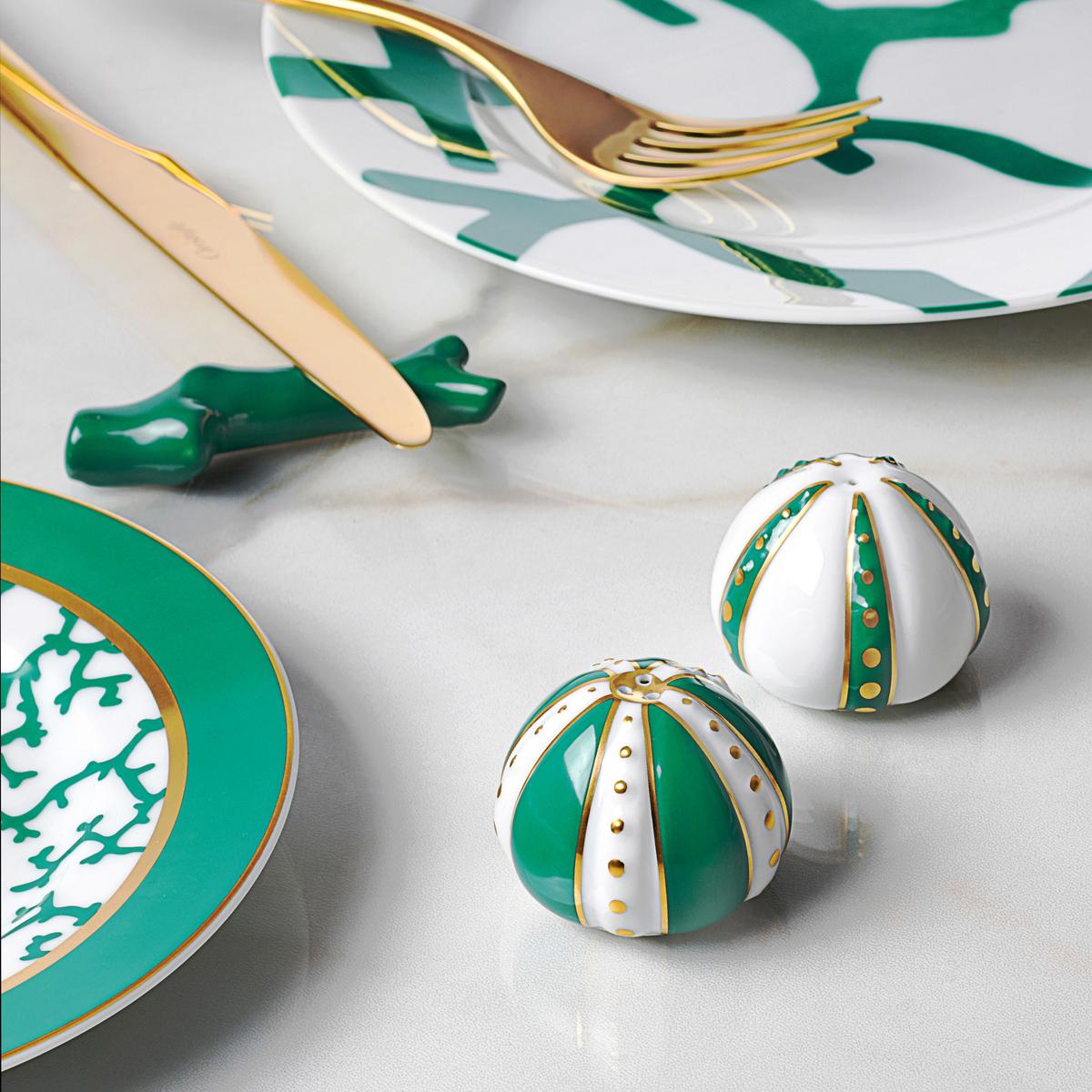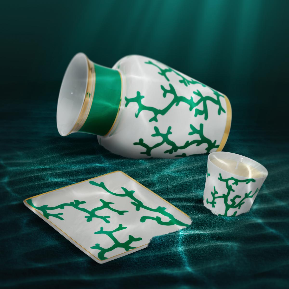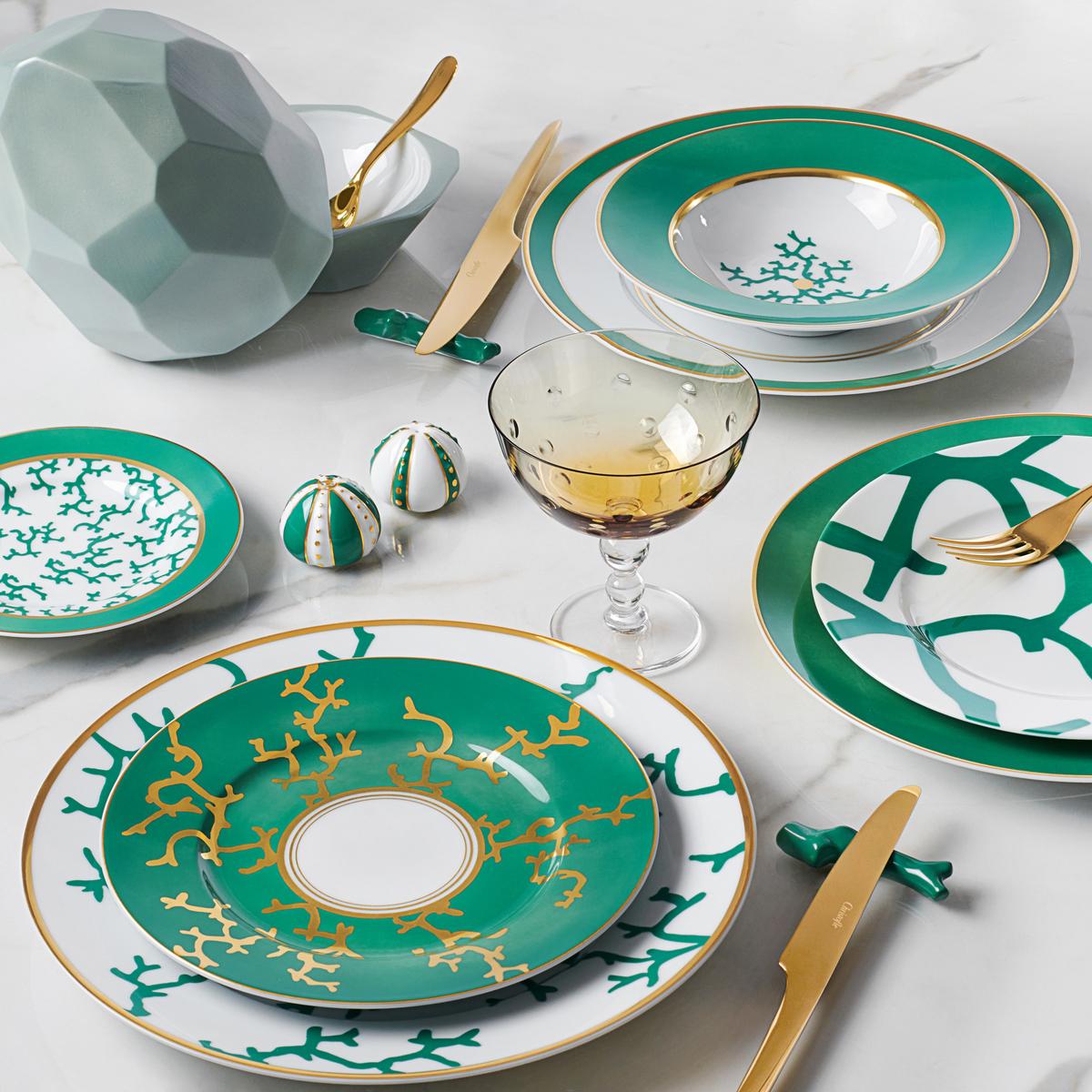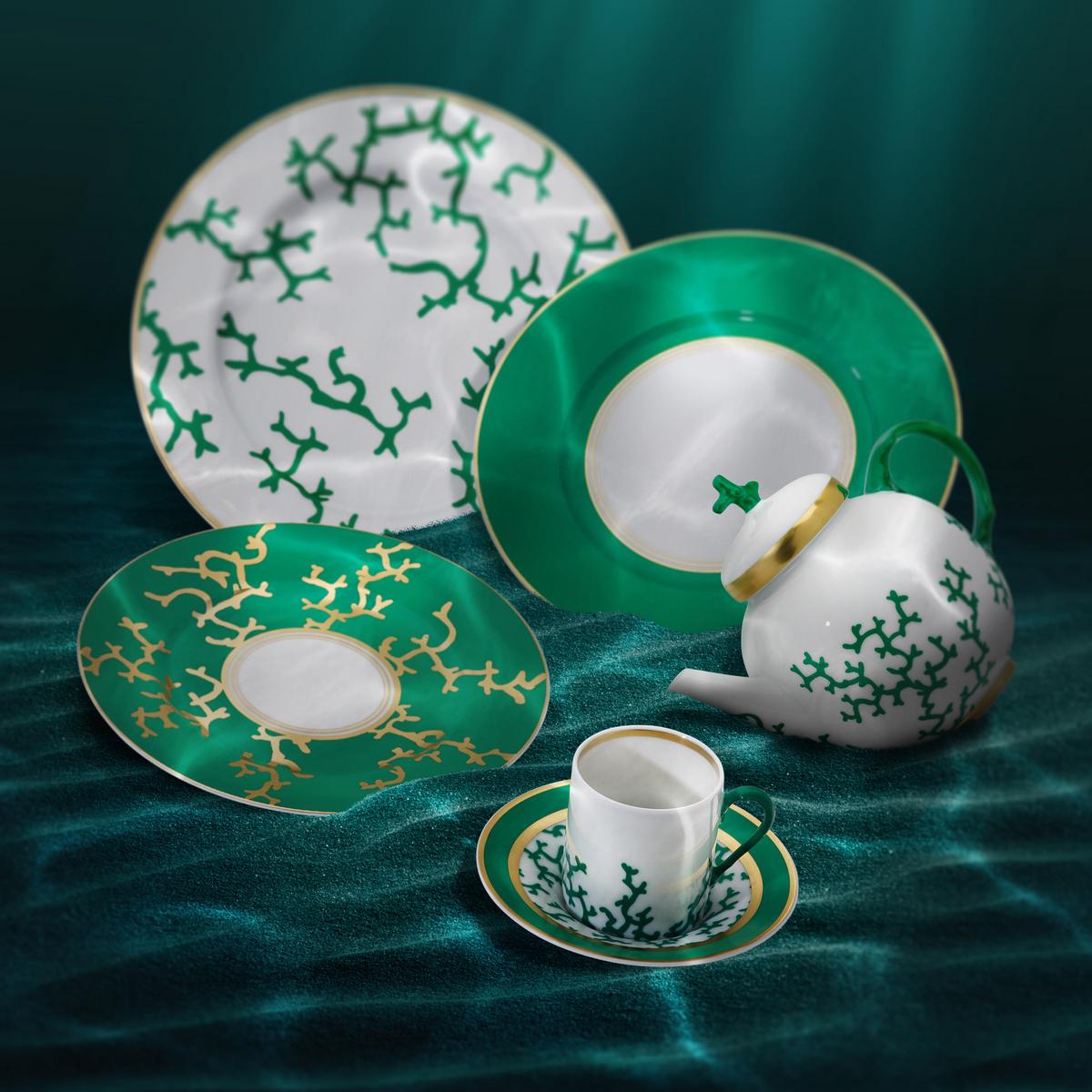 The emerald green color, which complements the original coral red collection ("Cristobal Coral") and the ultramarine blue version ("Cristobal Marine"), plunges un into the abyss and the mysterious sea pits. It is sometimes dense and deep on the coral handles of the cups or on the knobs of the teapots, sometimes soft, contrasting, nuanced and watercoloured on the plates decorated with coral motifs in harmonious shapes. Displayed in small touches on the table or staged in an opulent way, Cristobal composes, builds and invents infinitely with the elegance and generosity that characterize the talented decorator.