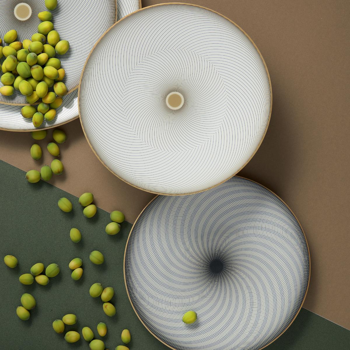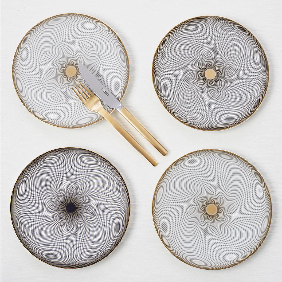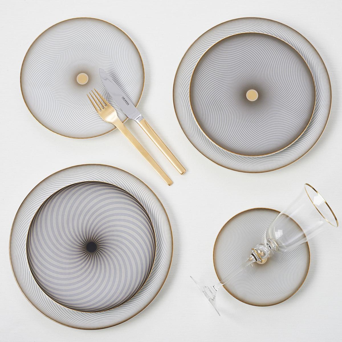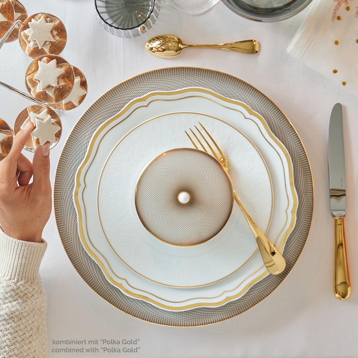 "Oskar" by Raynaud enchants the senses with its grandiose geometric design ‒ and there is a special appeal to the visual senses. Very fine lines in black and gold adorn Raynaud’s white Limoges porcelain. Upon examining each "Oskar" plate more carefully, you will notice that the geometric pattern varies slightly each time. That is exactly what is wanted from the designer Mariela Schwarz Montiel who has already conceived a number of dinner services for Raynaud. Most of the plates have a golden fixed point in the middle to which the eye-catching line pattern gravitates.