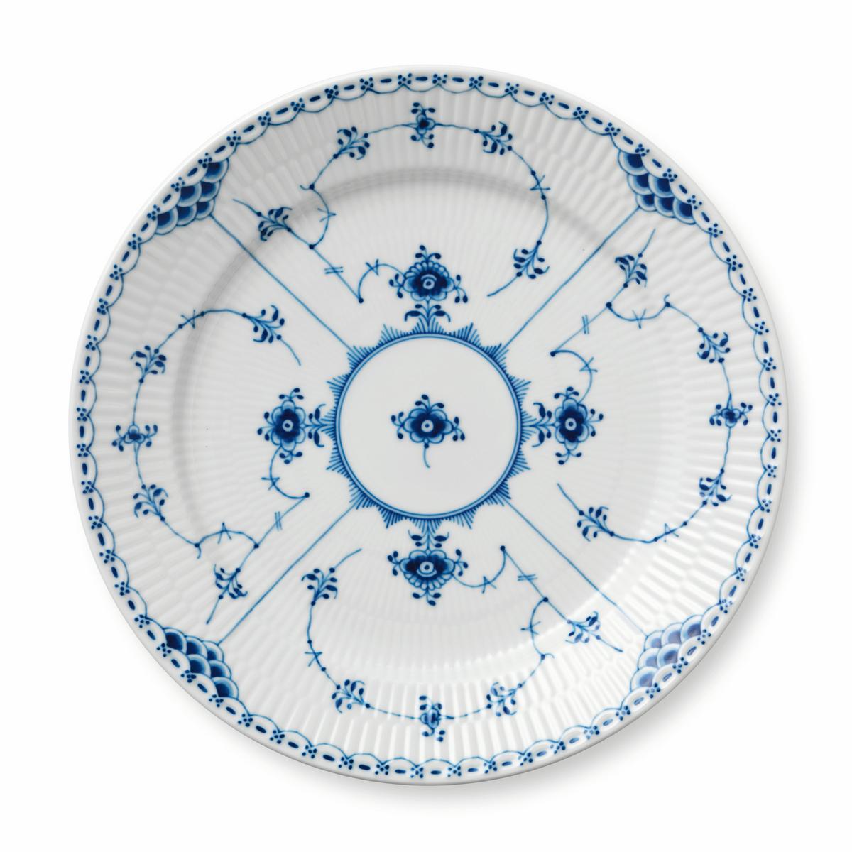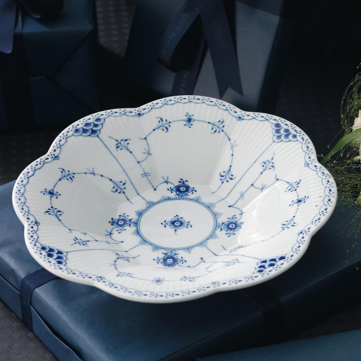 The blue and white porcelain service was developed in the late 19th century. Like all lines from Royal Copenhagen, the plates, bowls, jugs and plates from "Blue Fluted Half Lace" are elaborately painted by hand. A special feature is the cobalt blue pigment of Royal Copenhagen. The blue colour can withstand extremely high temperatures and is applied before final glazing and firing. This process makes the decors and porcelain more robust. The dinnerware can be put into the dishwasher without any problems.