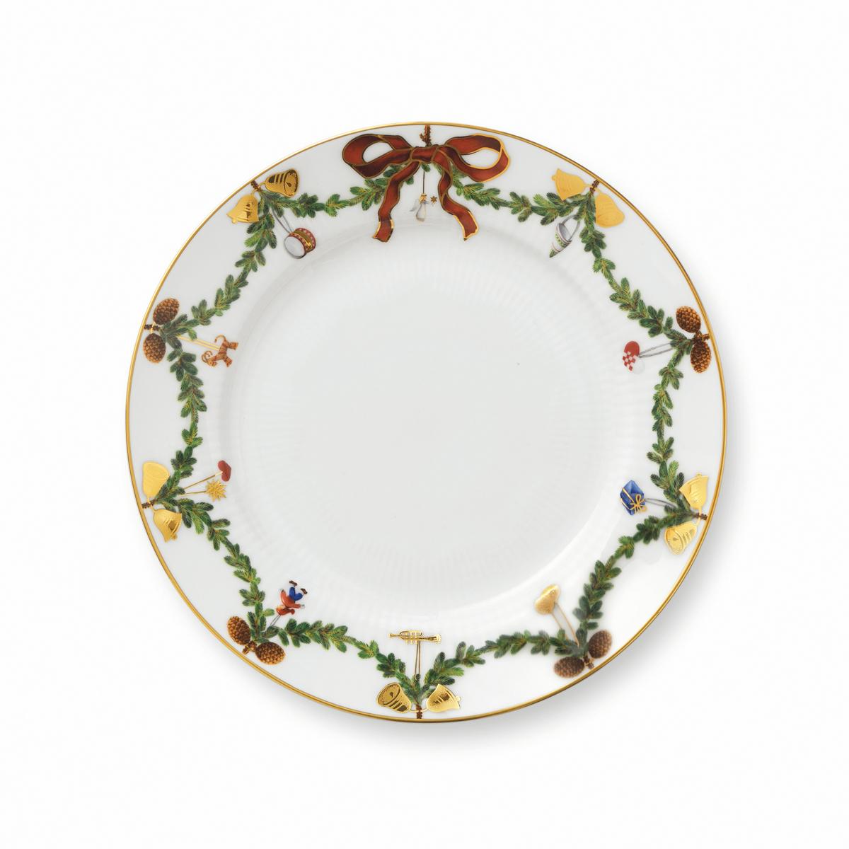 The fine bone china porcelain adorn angels, hearts, bells and drums. The classic Christmas symbols dangle from green fir garlands. A loving detail are the red satin bows, which are differently shaped on every piece of "Star Fluted Christmas" tableware.