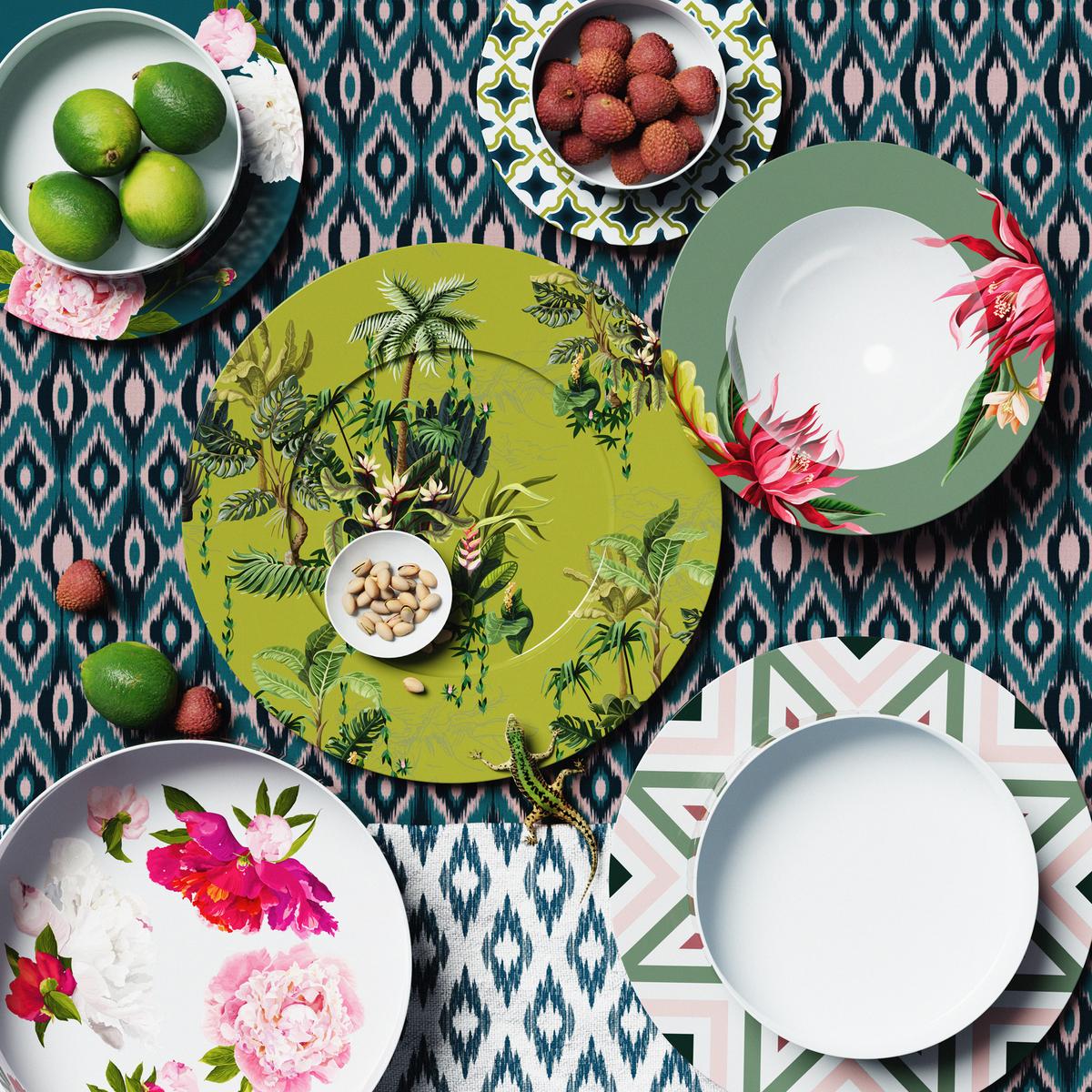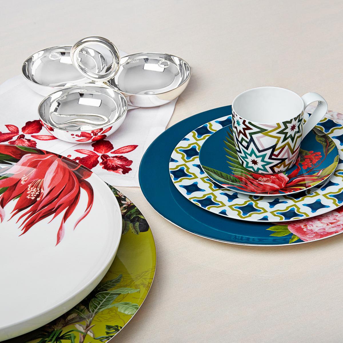 "Paraiso" from Sieger by Fürstenberg is like a journey to a place you long to visit – a homage to the beauty of the earth, the richness of nature and the diversity of cultures. With imaginative designs and lots of colour, the dinnerware brings all the world’s continents to the table. Asian peonies are paired with traditional Mallorcan weave patterns, Portuguese-inspired designs or tropical plants.