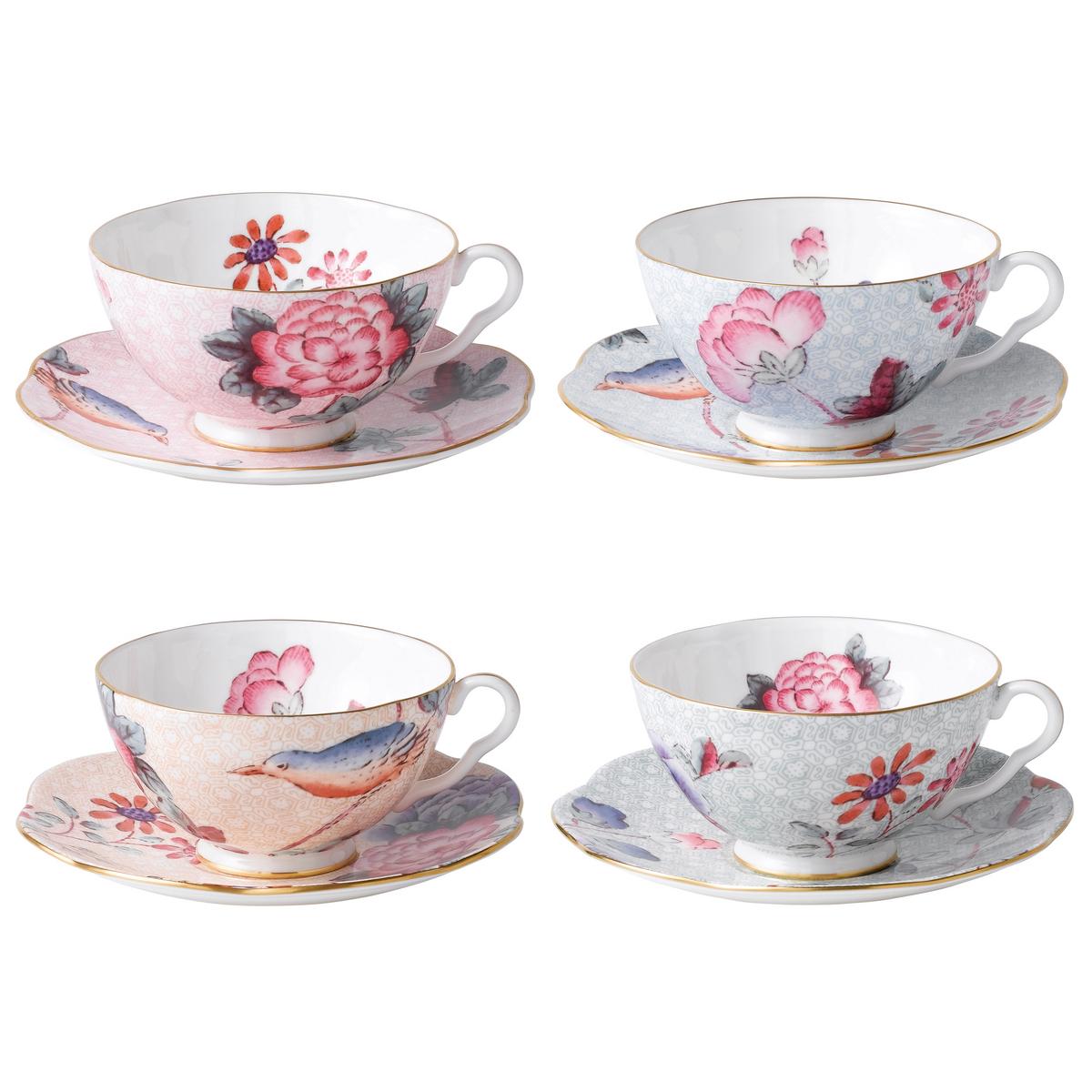 The colourful "Cuckoo" service from Wedgwood is perfect for a convivial tea party. The "Cuckoo" collection takes its inspiration from Chinese flowers and birds, which richly adorn the individual pieces of the fine bone china tea service. It is difficult to decide which colour is better: blue, pink, green or peach. Luckily, all of the colours of the "Cuckoo" dinner service can be beautifully combined with one another. The plates and saucers have gentle undulating lines and a gold rim.