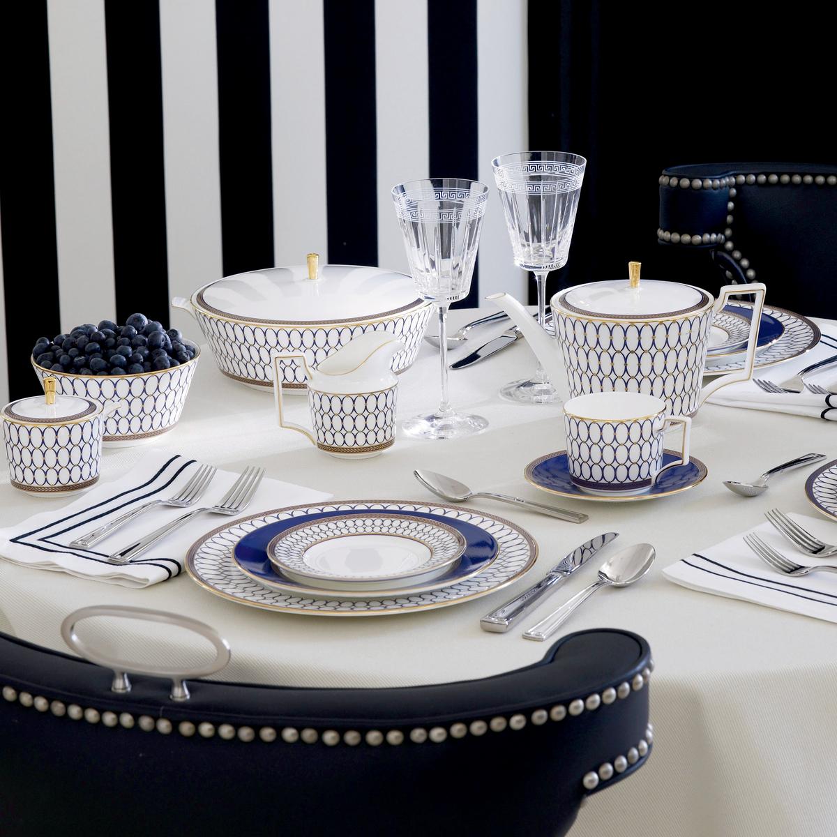 If you are looking for a change from a plain dinner service, then you will like the "Renaissance Gold" choice offered by the English porcelain manufacturer Wedgwood. The designers at Wedgwood have not spared on the glittering gold that flaunts itself on the deep cobalt blue background. A different motif adorns each plate, with sometimes less and sometimes more cobalt blue or gold. With its elegant decoration, the fine bone china service "Renaissance Gold" from Wedgwood adds a touch of royalty to every table.