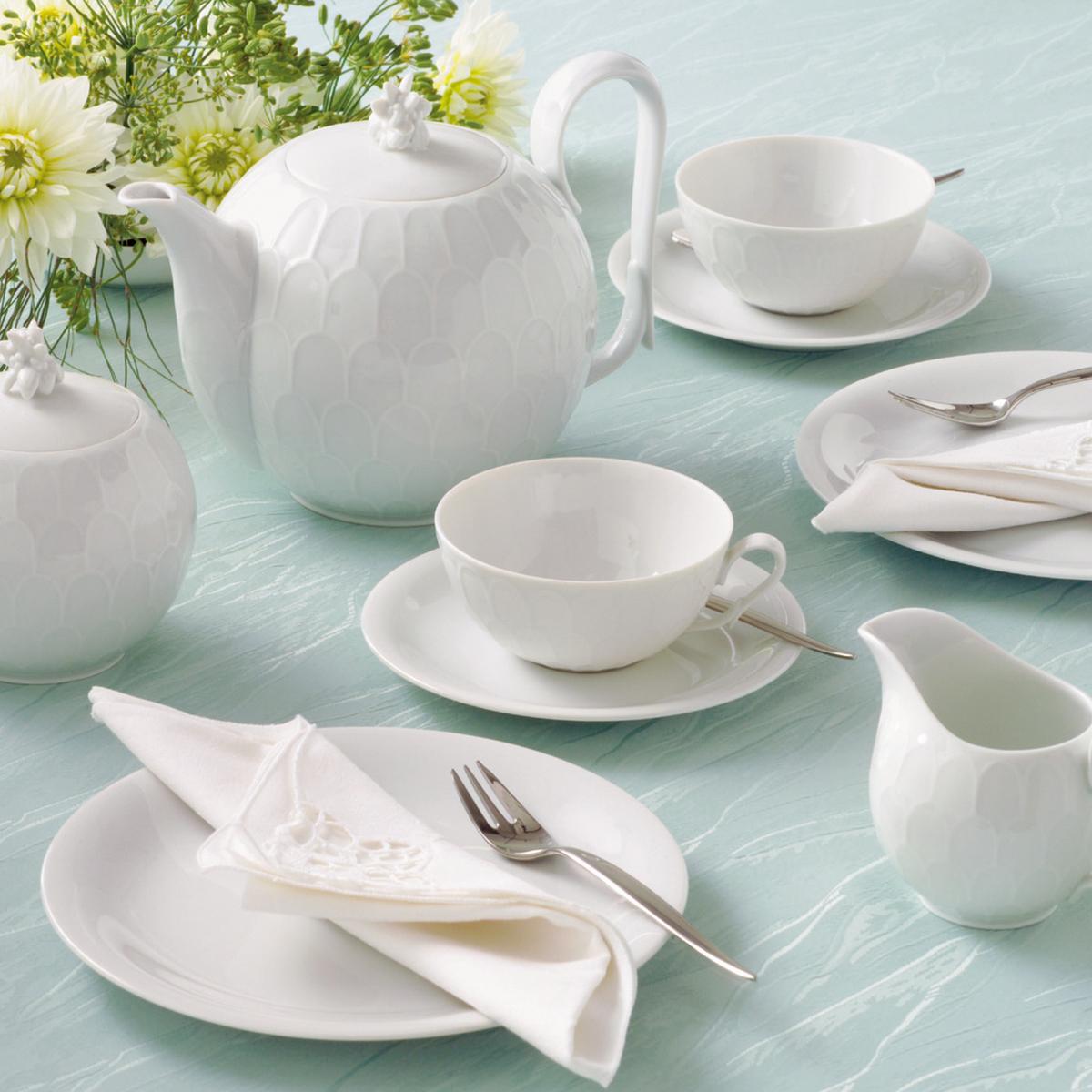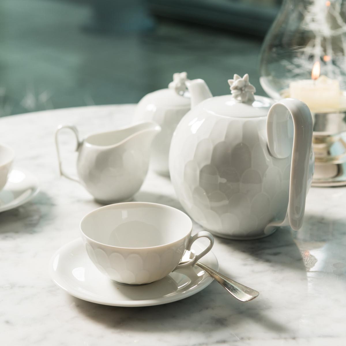 A modern classic, this "Atlantis" tea service was designed by Joseph Hoffmann in 1930 for Augarten Porcelain. The formal style of the "Atlantis" reflects the unconventional approach of the co-founder of the Viennese factory and is characterised by the structured, scale-like surface that shows off the white porcelain to particular advantage.