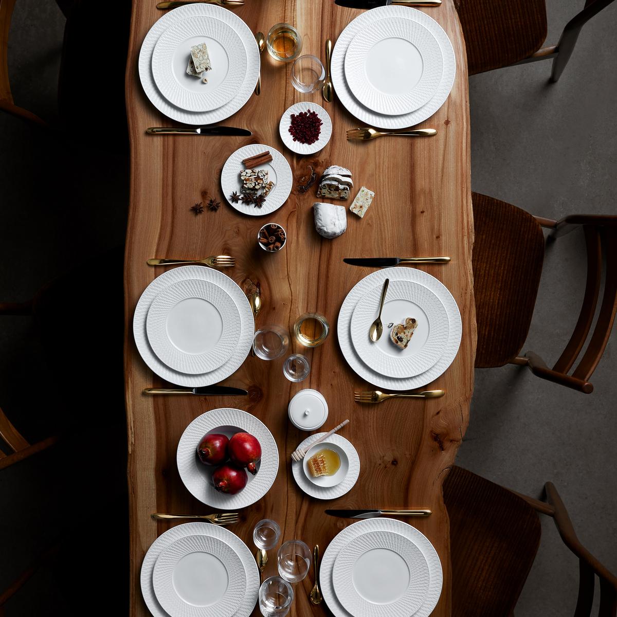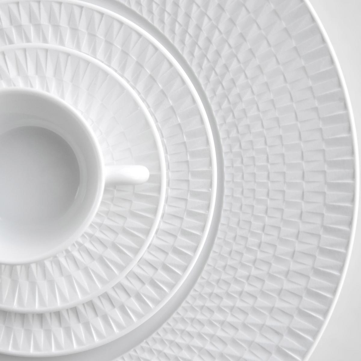 The result is an unprecedent subtle effect of a rigorously geometric pattern taken in twisted momentum. Engraved on the rim of the plates and on the outside of the various pieces of the Bernardaud collection, it is the light that reveals the alternation of matt and shining rendering giving a vibrant radiance that enlivens the whiteness of porcelain.