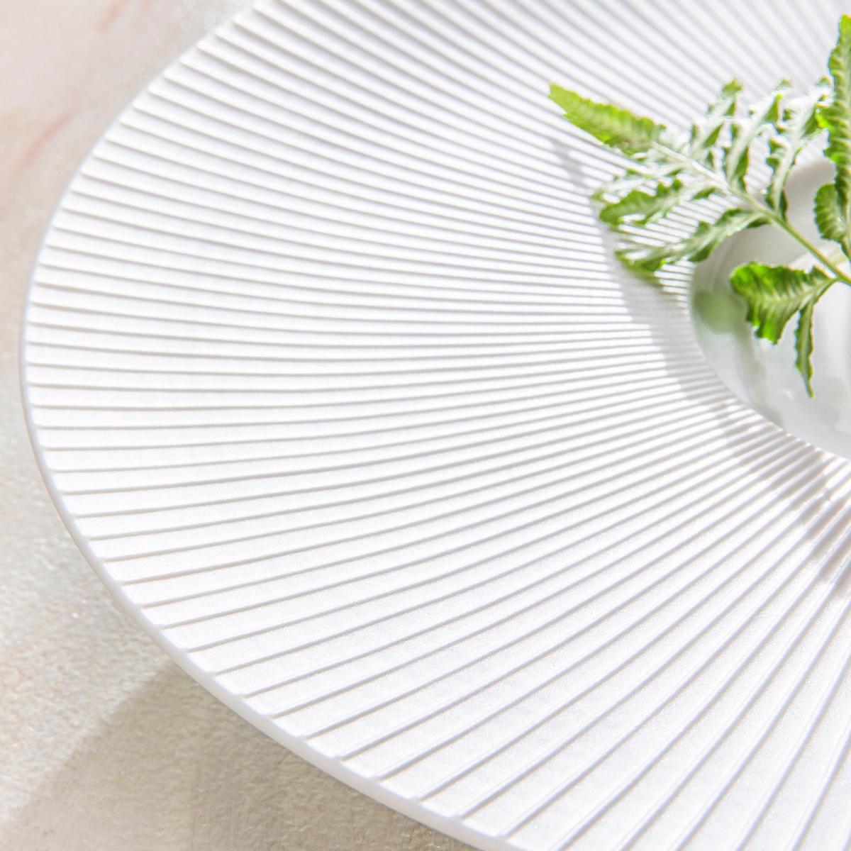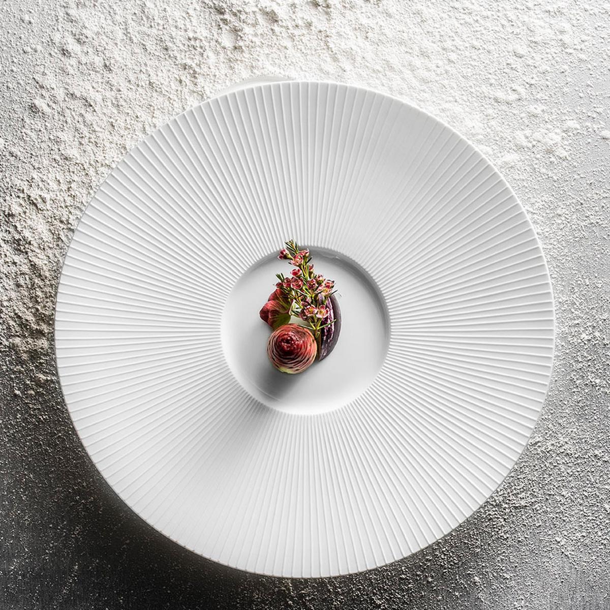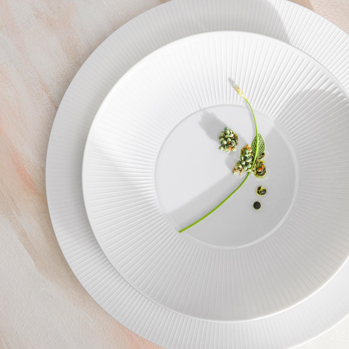 Refined porcelain with charisma - The "Bolero White" dinnerware by J.L Coquet has a striking presence and appearance despite its simple shapes. Fine radiant engravings are characteristic of the collection made of the finest Limoges porcelain. The special surface structure of "Bolero White" is also a haptic experience. The satin-finished plate rims contrast with the glazed plate mirrors. This contrast gives the elegant dinner service an organic warmth.