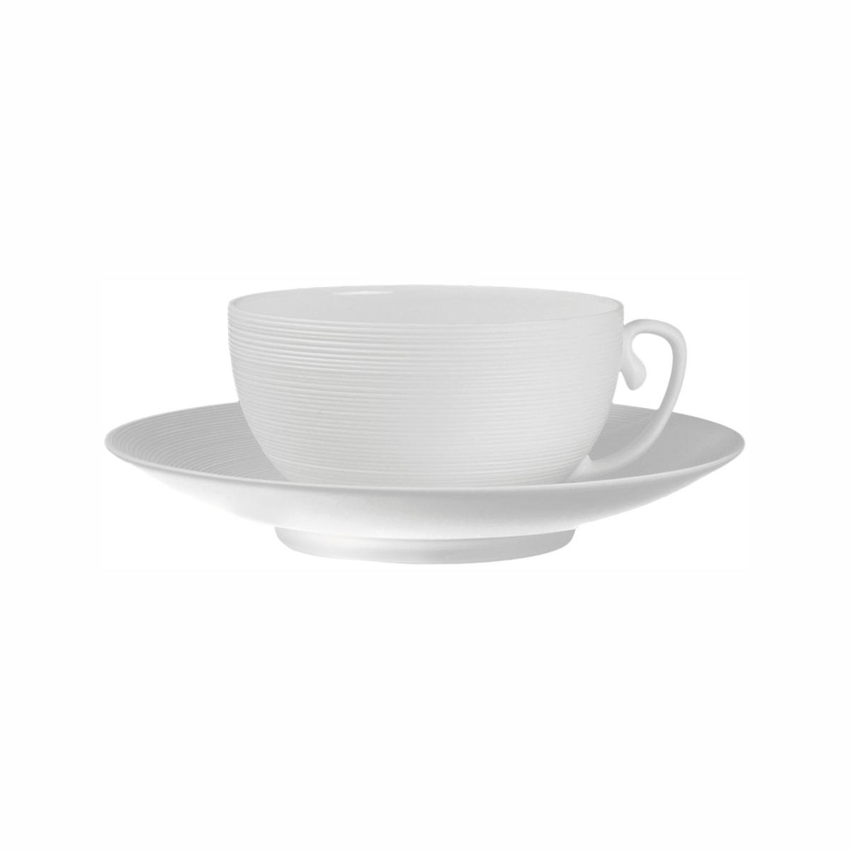 To achieve the pure white colour and outstanding quality of the porcelain, the porcelain paste matures for up to three months in the cellar of the manufactory before it undergoes around 20 manual work steps. The hand-drawn grooves are protected by a special mineral mask that is as robust as a traditional glaze while preserving the biscuit-like appearance of the porcelain. "Hémisphère White" is scratch-resistant, microwaveable and dishwasher-safe, making it ideal for professional and everyday use.