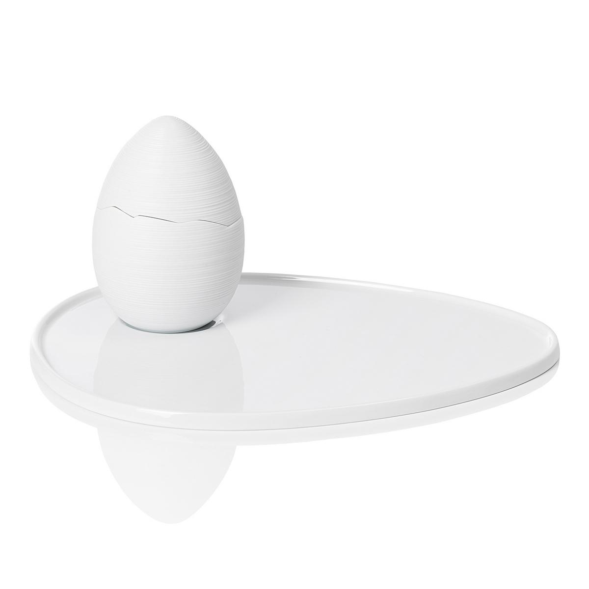 The "Hémisphère" matching tray provides the broken egg the perfect stage for its appearance. The broken egg has the velvety textured surface characteristic of the "Hémisphère" line. The tray, on the other hand, is made of shiny glazed Limoges porcelain.