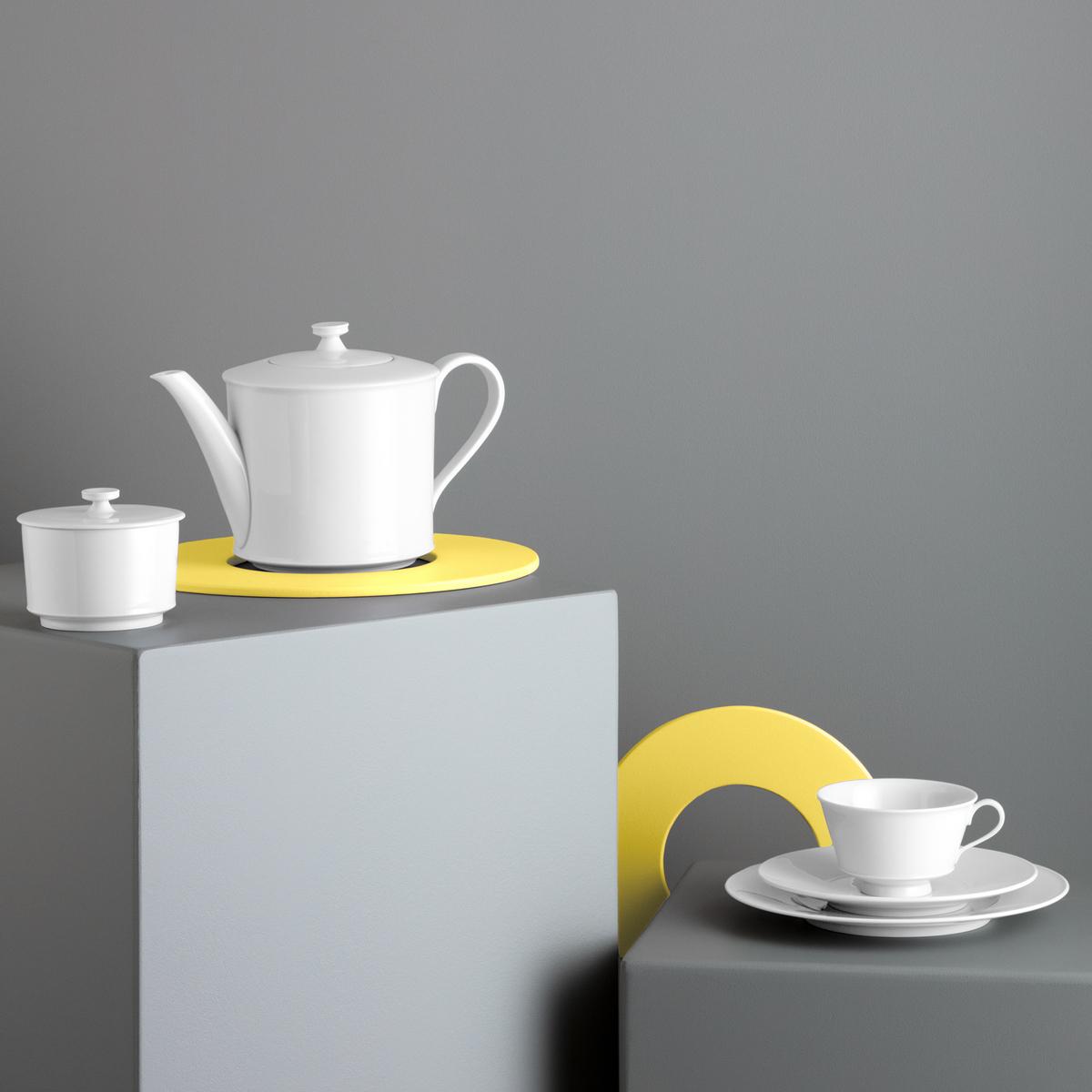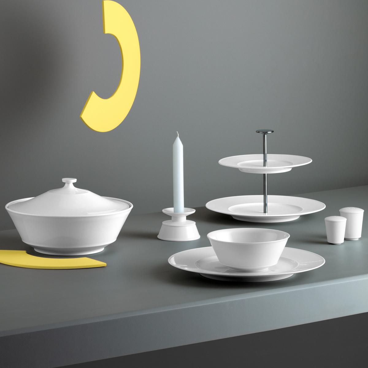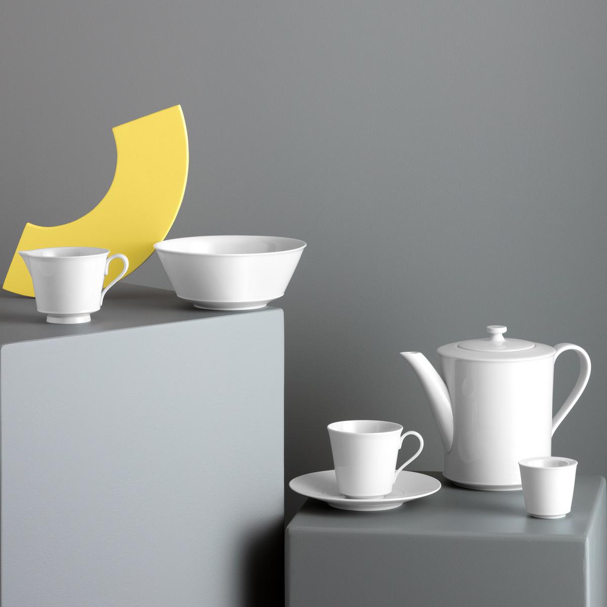 The "Urania" porcelain dinner service from KPM was designed originally by Trude Petri in 1938. The shapes of the receptacles are cylindrical and conical.