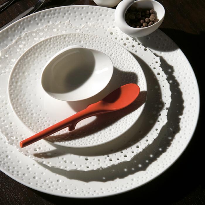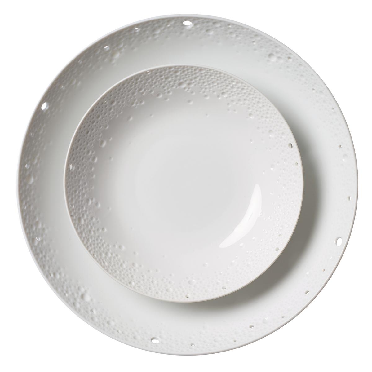 The "White Coral" dinner service from the Nymphenburg porcelain manufactory is one of Ted Muehling's most ingenious designs. With this concept, the New York designer demanded the utmost skill from the Munich porcelain artists. Inspired by the sensuous appearance of sun-bleached coral, Muehling created these wafer-thin plates. The edges are partially pierced and "broken" (irregular). Ted Muehling was only able to dare this porcelain experiment with the help of the experienced craftsmen of the Nymphenburg porcelain manufactory. Using high-quality techniques dating back to the eighteenth century, these experts are still hand-manufacturing Europe's finest porcelain.