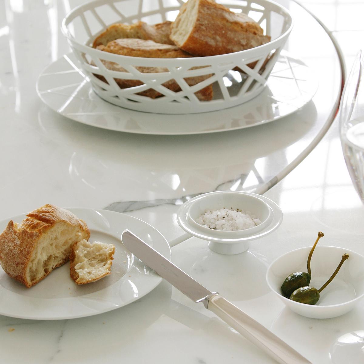 The base of the cylindrical bowls has been designed, for example, to fit exactly into the centre of the rimmed plates, while the cloches can be combined with the rimmed plates as well as the cylindrical and round bowls and - when turned upright - can serve as bowls, too.