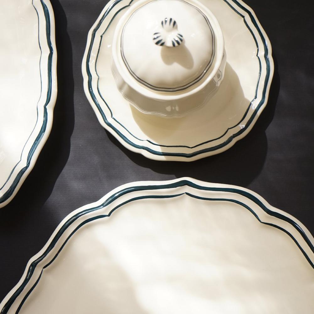 Gien presents with "Filets Acapulco" a new colour variation of its famous faience "Filets Bleu". The Gien "Filets Acapulco" captivates - like all "Filets" services - with its elegantly curved shell shape of ecru-coloured faience, which is underlined by a hand-applied edge in an intense peacock tone.