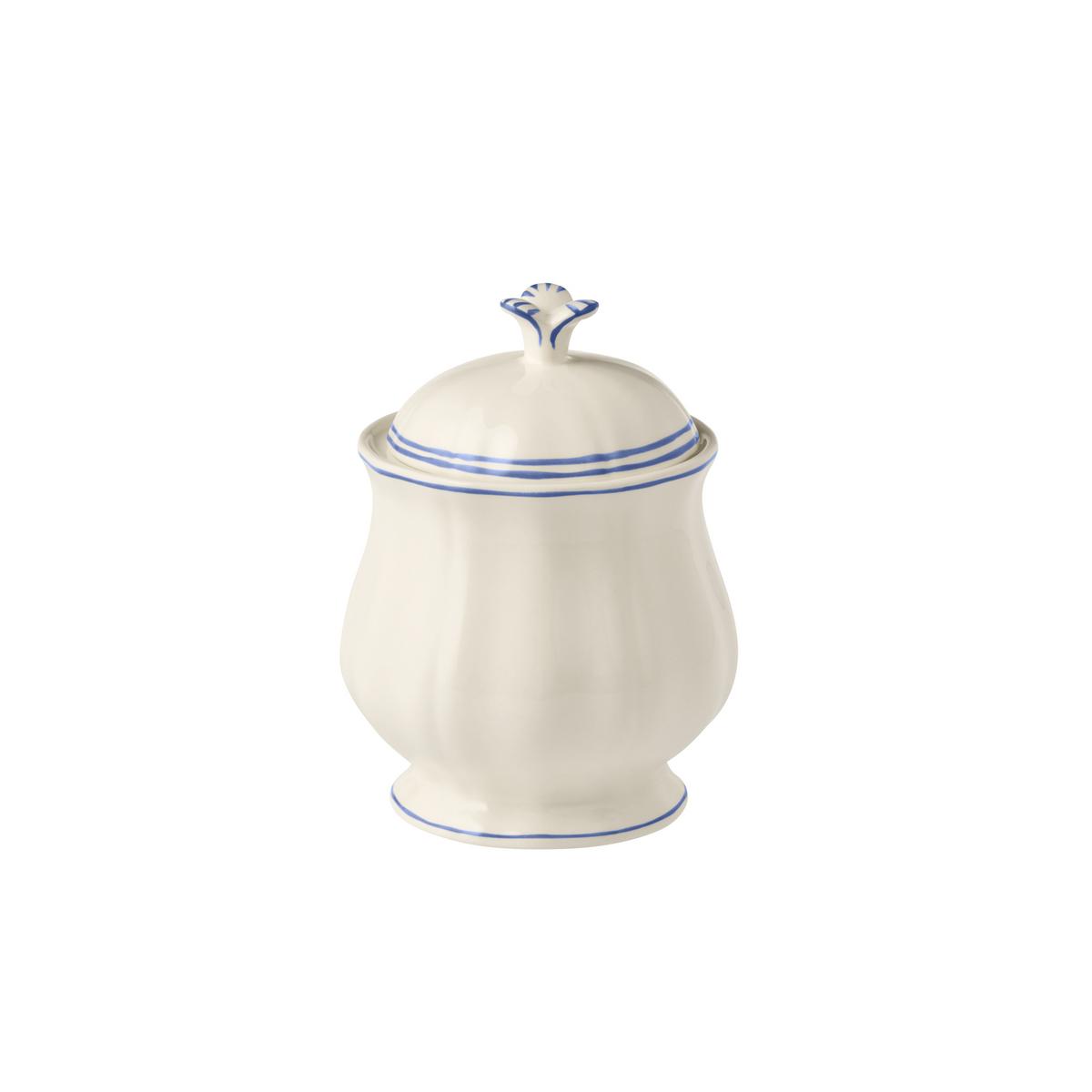 The "Filets Bleus" ecru-coloured dinner service by Gien has its own individual charm, with its simple, yet refined, handpainted blue border that accentuates the shape and elegance of each piece.