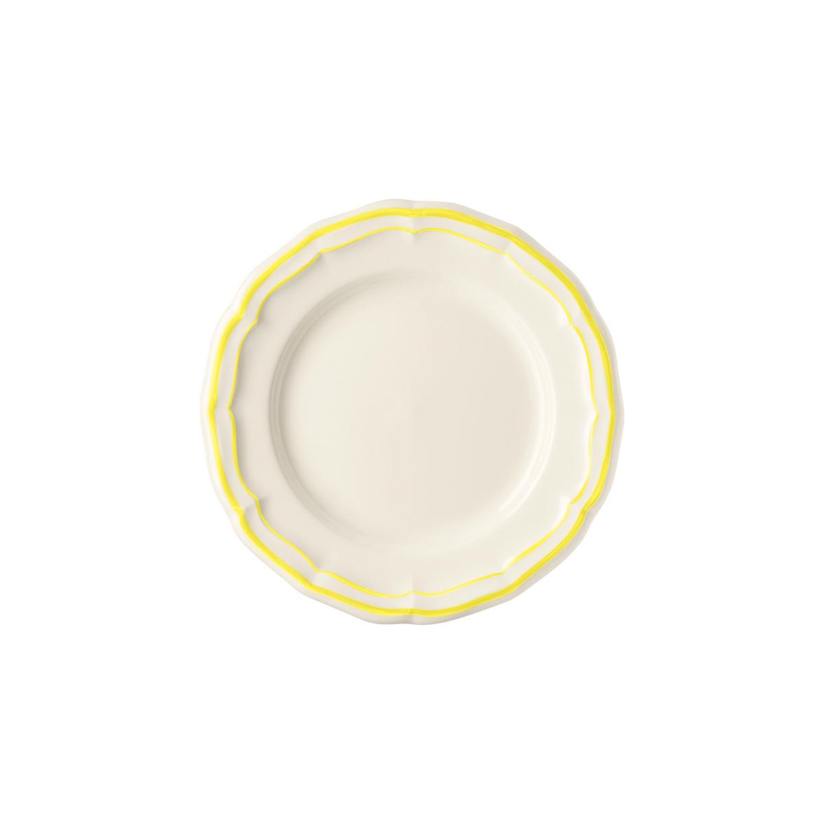 The "Filets Jaune Citron" dinnerware is a new colour variation of the famous blue classic "Filets Bleu" from Gien. The enchanting shell shape of the dinner service of ecru-coloured faience is adorned with a hand-painted line in "Jaune Citron" (lemon yellow). The delicate brush strokes applied by hand make each piece unique.