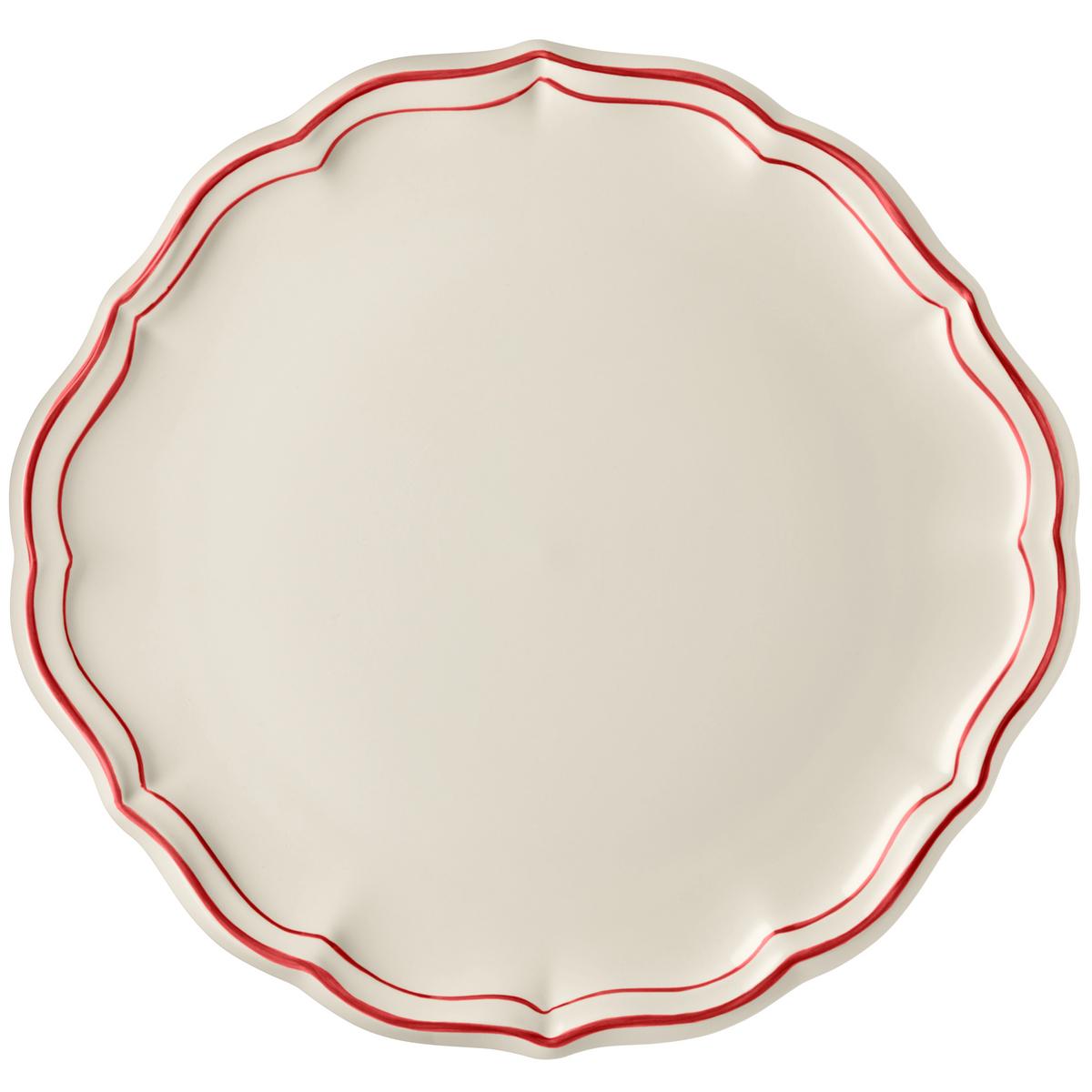The "Filets Rouge" dinnerware is a new colour variation of the famous blue classic from Gien. The enchanting shell shape of the dinner service of ecru-coloured faience is adorned with a hand-painted line in red.