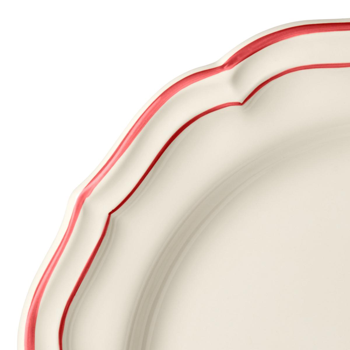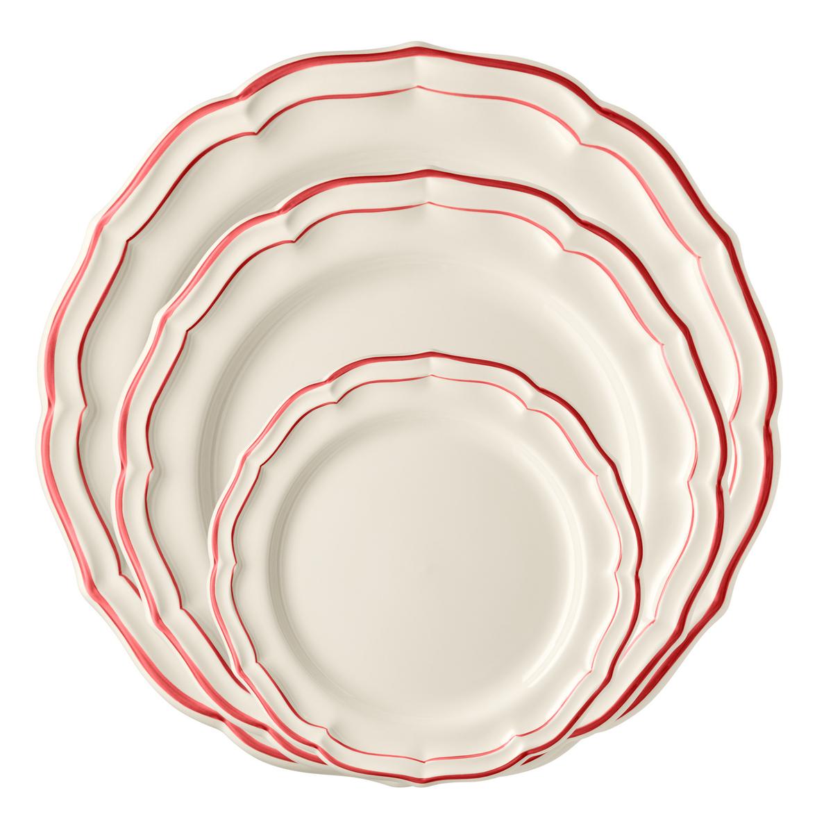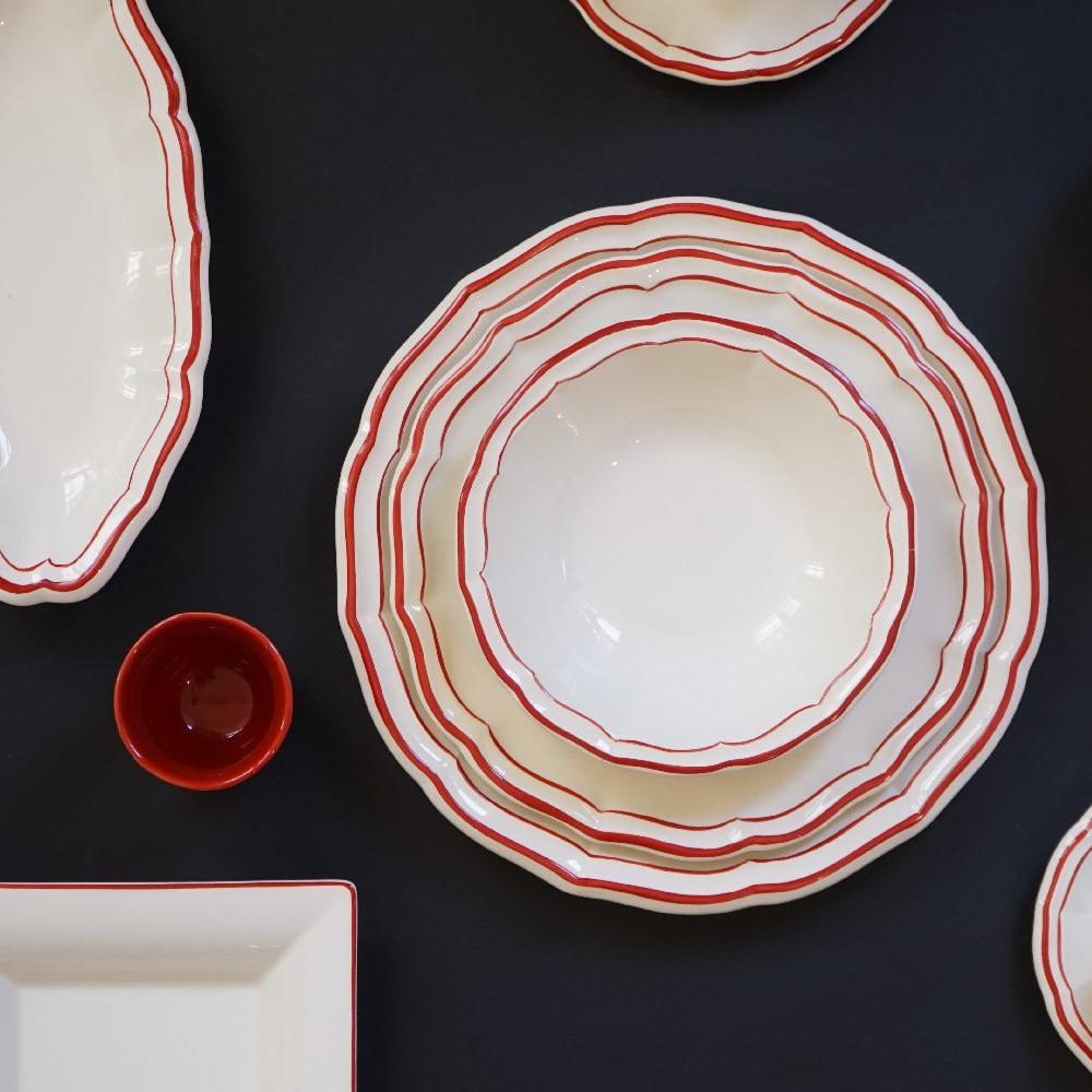 The "Filets Rouge" dinnerware is a new colour variation of the famous blue classic from Gien. The enchanting shell shape of the dinner service of ecru-coloured faience is adorned with a hand-painted line in red.