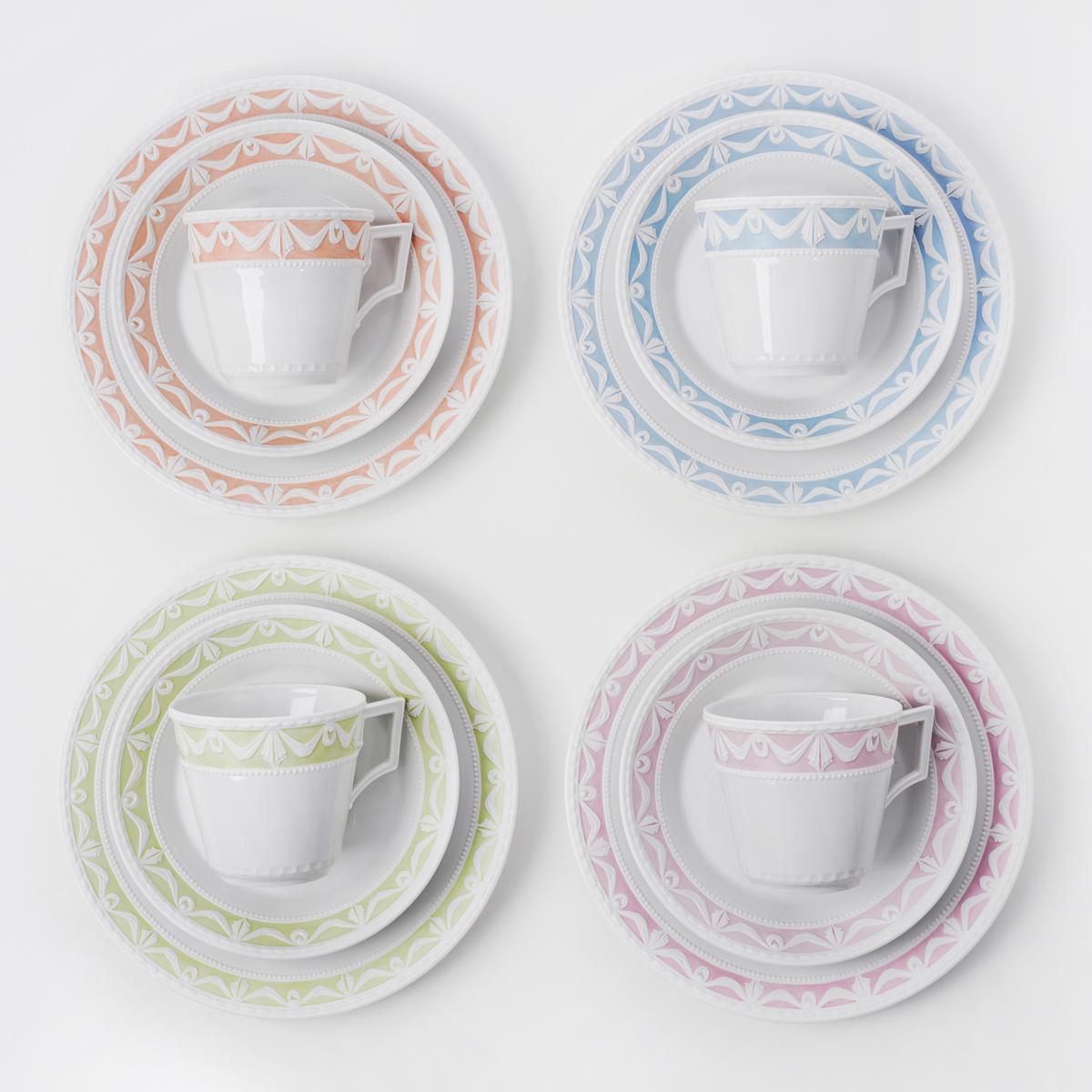 To celebrate its 250th anniversary, the Berlin porcelain manufacturer KPM designed the spectacular "Kurland Blanc Nouveau" dinnerware. Now the collection has been extended to include "Kurland Pastel". Six wonderful pastel colours bring a touch of summer freshness to your table. By combining the white with the delicate pastel colours, the distinctive antique-style border of matt bisque porcelain is accentuated even more.