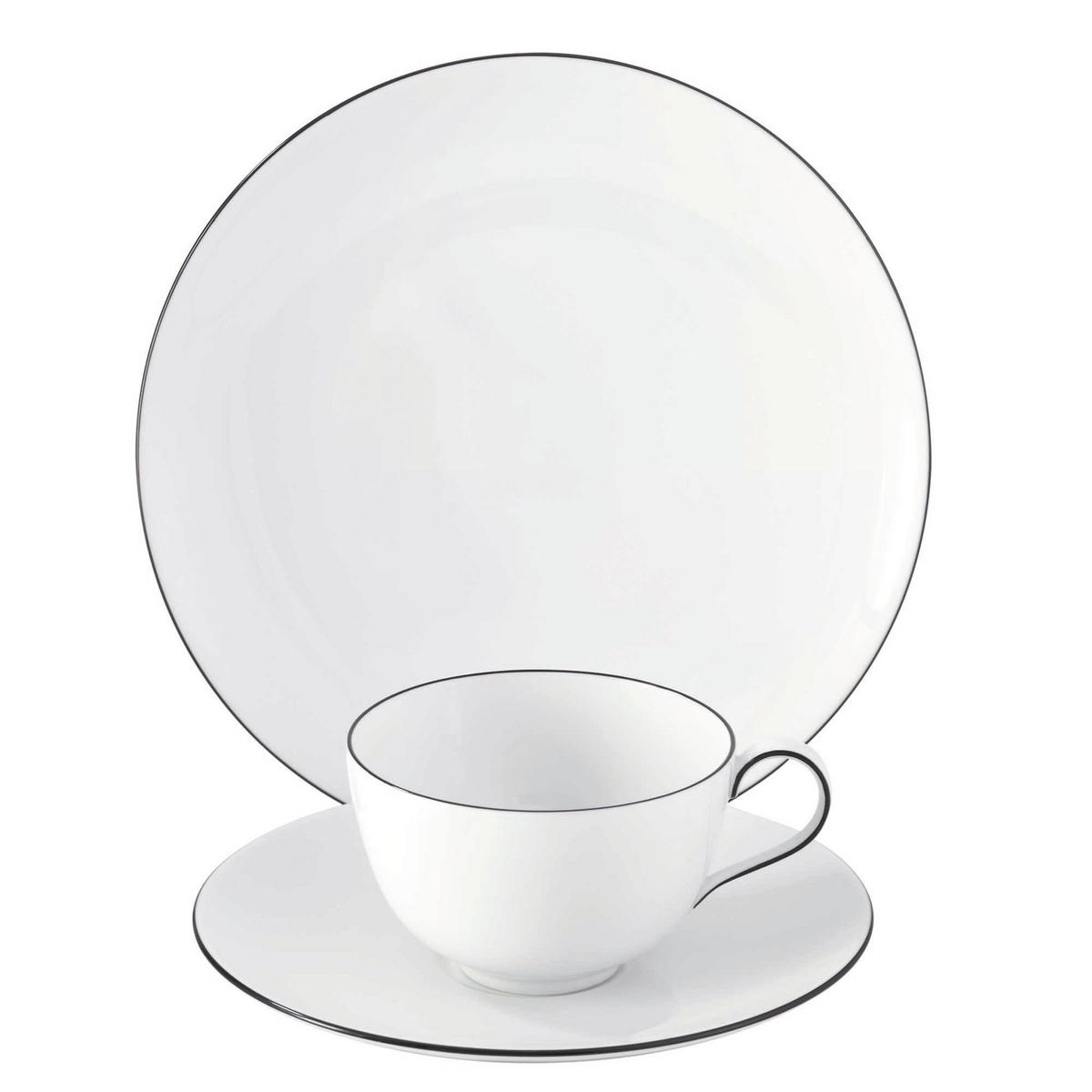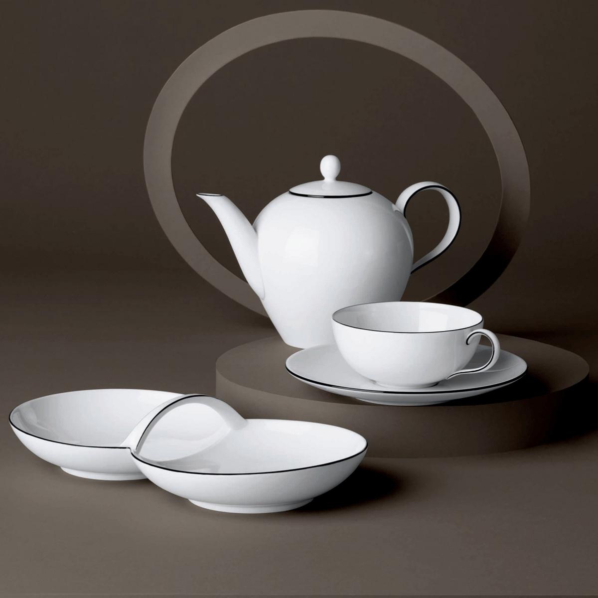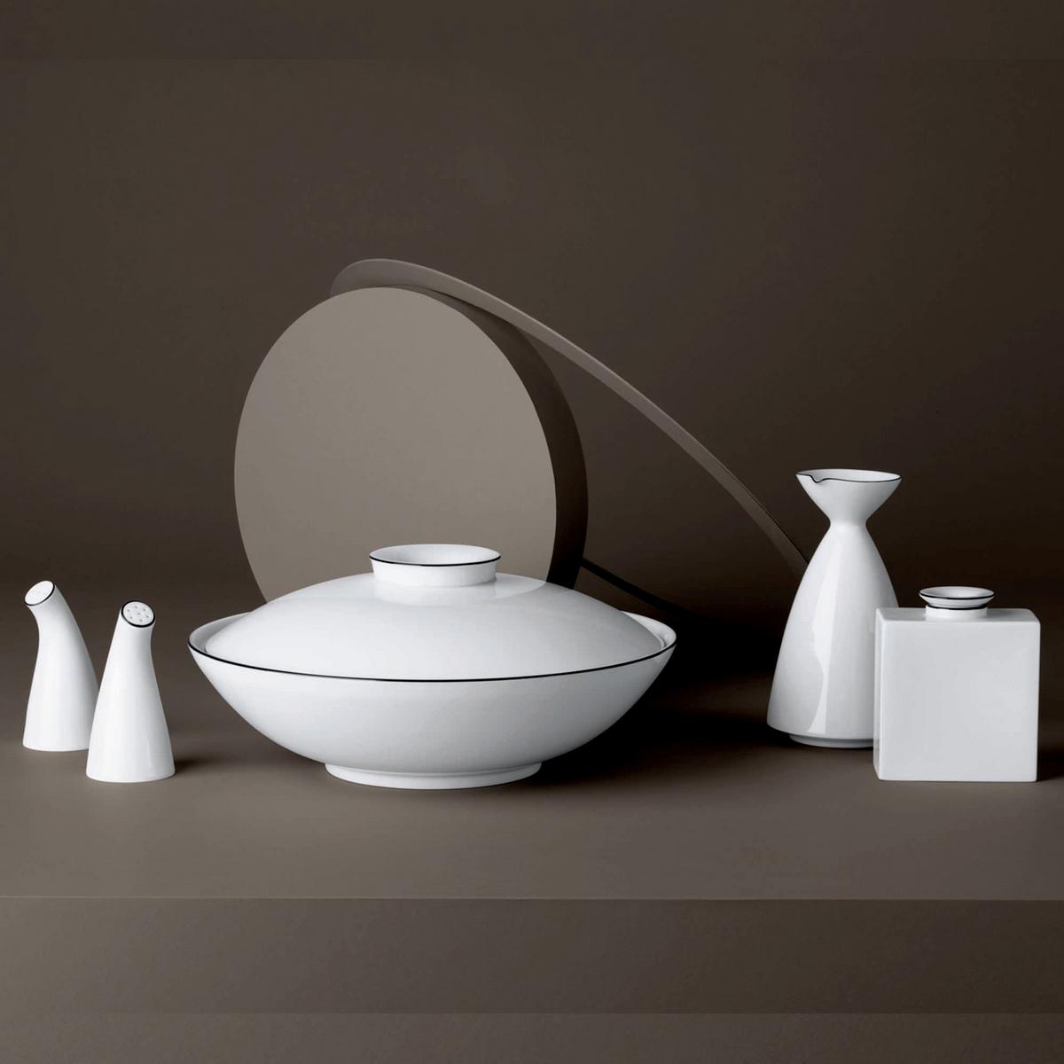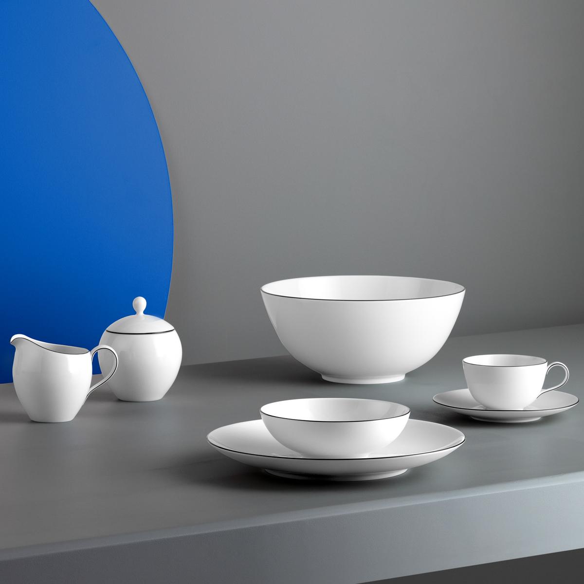 The white "Urbino Canto" dinner service from KPM has been refined with a black, hand-painted rim. The fine colour line is quick fired at around 1300° C, which makes the porcelain suitable for the dishwasher.