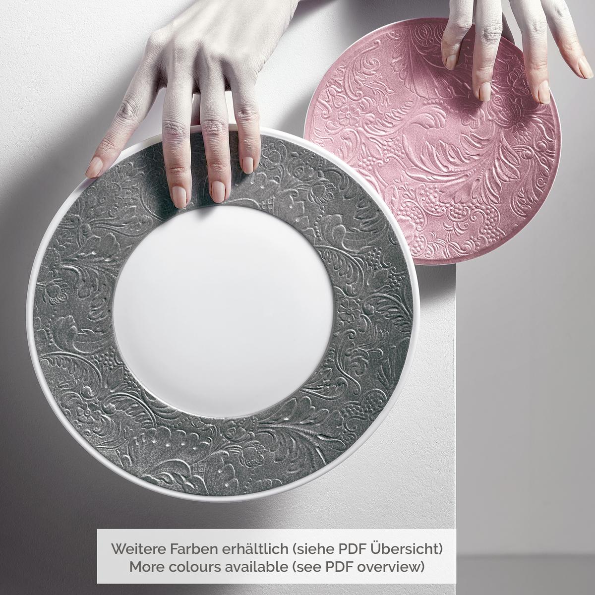 To produce "Italian Renaissance" requires particularly careful handwork in the workshops of the Manufacture Raynaud. The elegant decor is finished with matte colors or precious metals such as platinum and gold. "Italian Renaissance" is available in many different iridescent colours. Please take a look at our colour overview: "Italian Renaissance" colours (view PDF). Within each color there are pieces with full decor and partial decor. The partially decorated pieces have a white outer rim.