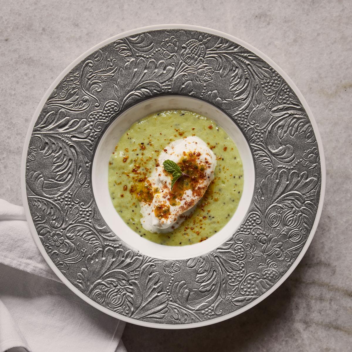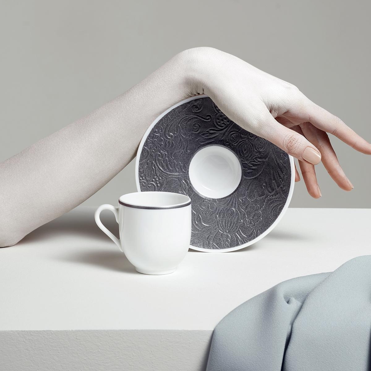 Raynaud's "Italian Renaissance" collection is adorned with a rich floral decor. This decor is inspired by wall coverings from the 19th century, with which the most famous residences and noble houses, for example, the Buckingham Palace, were decorated. Raynaud collaborated with the English brand Lincrusta®, renowned since 1877 for its incredible wall coverings with opulent and deep embossing.