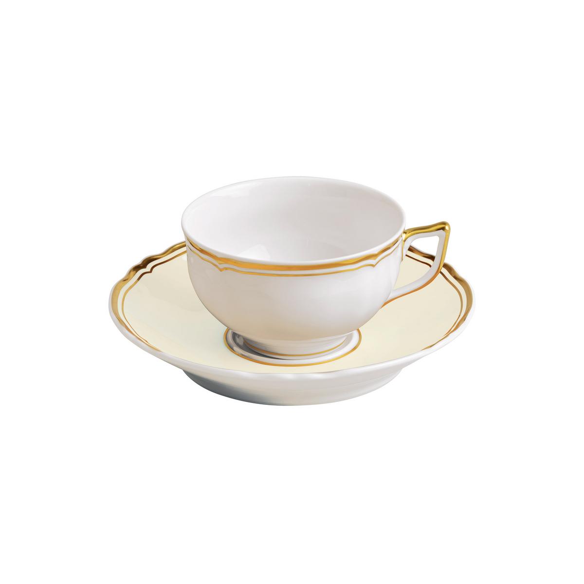 "Mazurka" by Raynaud is based on a traditional shape dating back to the time of Louis XV. The curved and gilded edges enhance the high-quality Limoges porcelain in a royal way. The gold rims are applied to the individual pieces by hand.