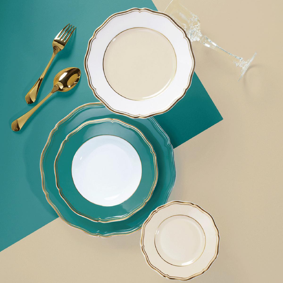 "Mazurka" by Raynaud is based on a traditional shape dating back to the time of Louis XV. The curved and gilded edges enhance the high-quality Limoges porcelain in a royal way. The gold rims are applied to the individual pieces by hand.