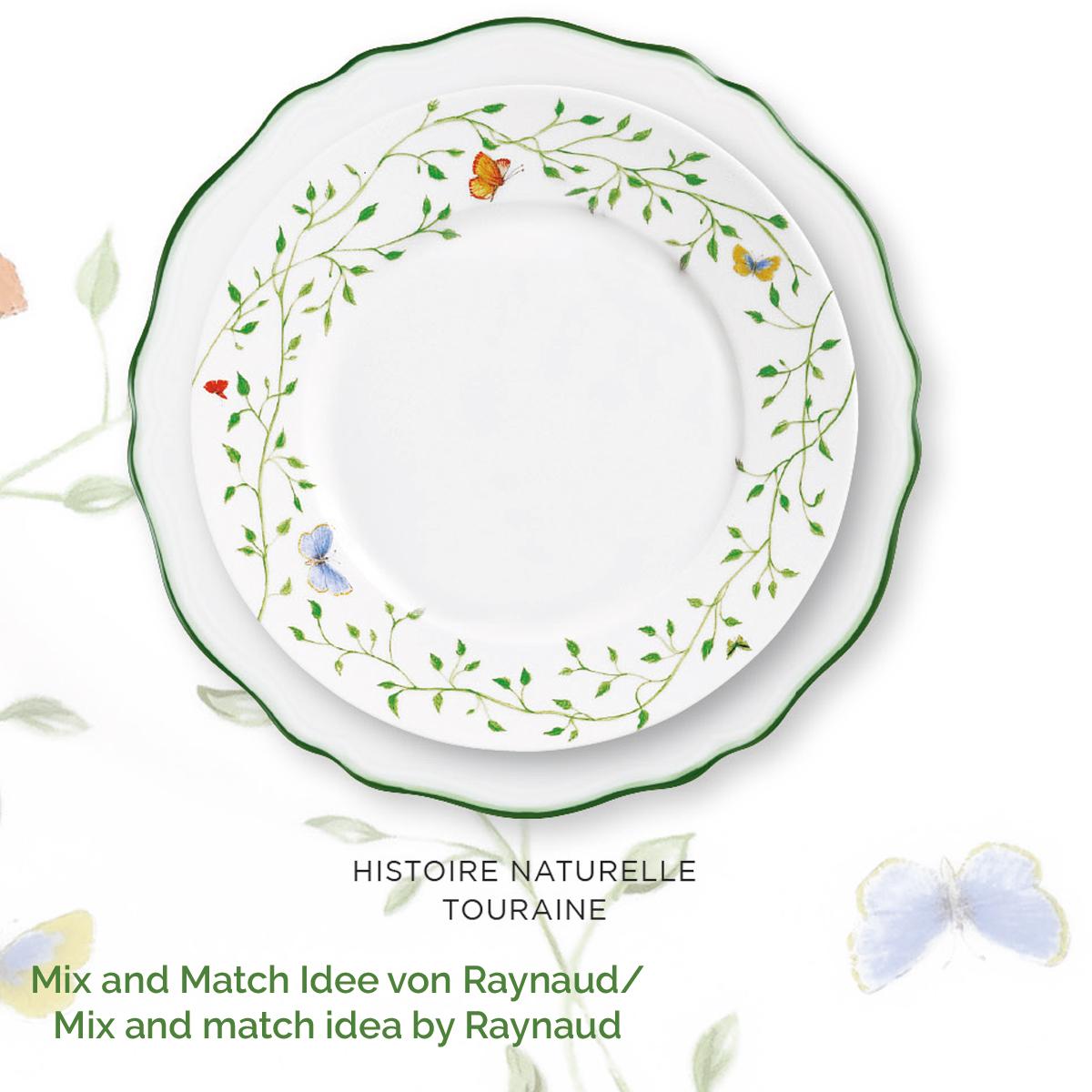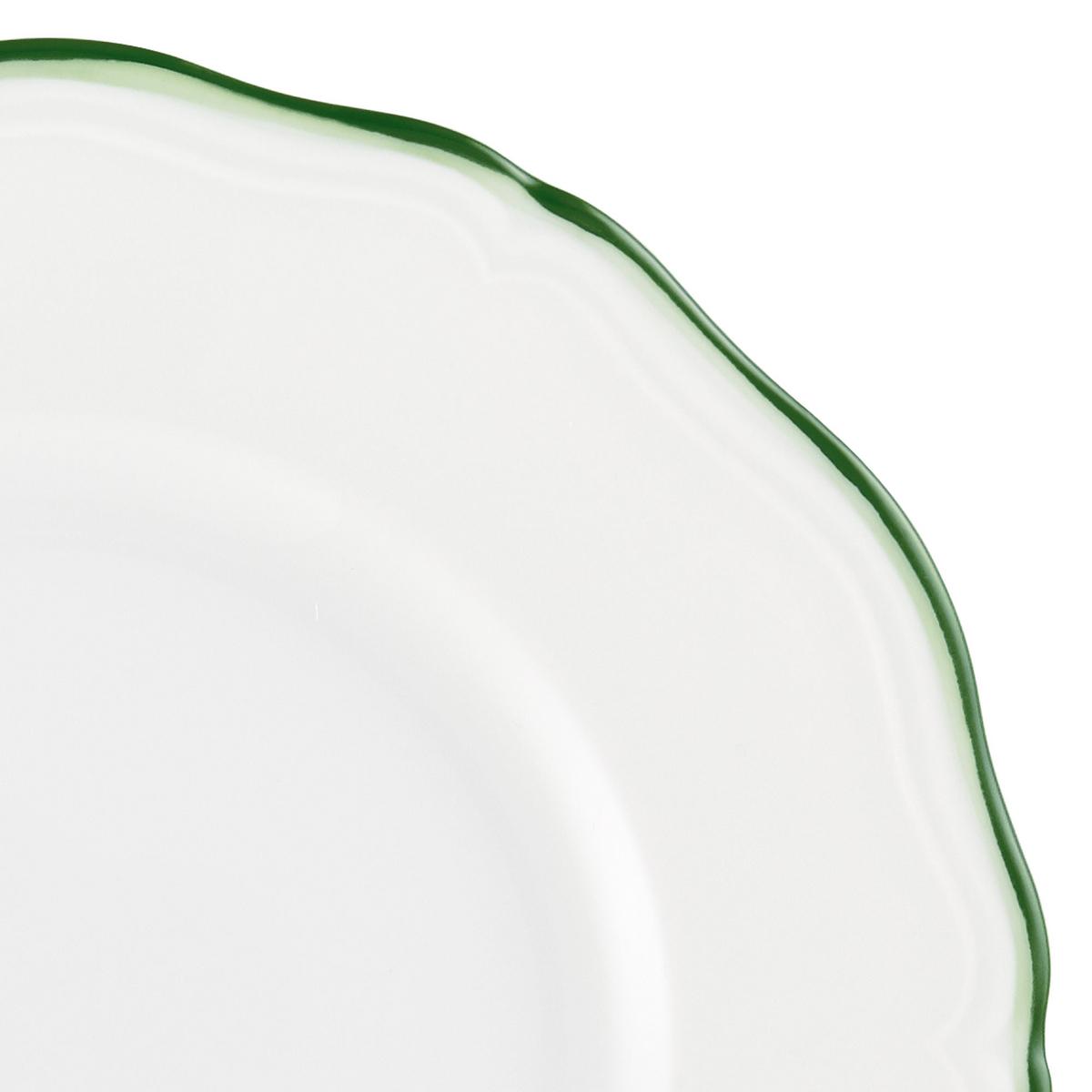 Raynaud‘s "Touraine Filet Vert" gleams in the famous white of Limoges porcelain. In itself, the porcelain with the fine green rim is quite sleek and simple. Raynaud‘s "Touraine Filet Vert" is the successor to the "Villandry" line. The dinner service is framed in a rim that has been hand-painted using two colours, moss green and light green; the rim of the plate, which does not bear a wicker pattern, appears somewhat sleeker than its predecessor.