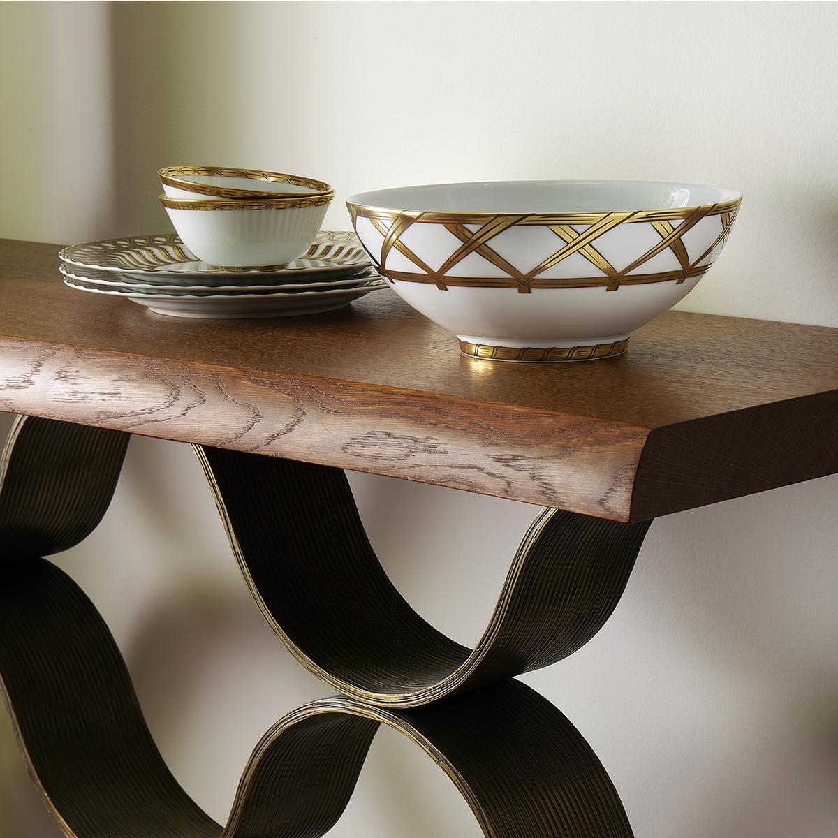 The artistic relief design of the handpainted Limoges porcelain is reminiscent of the surface structure of a basket chair. The gold colouration ensures a touch of classic elegance. Alberto Pinto took his inspiration for this "Vannerie" design from Jean Michel Frank's rattan chairs from the 1930s. These Bauhaus classics stand for elegant minimalism combined with natural materials. In the opinion of Albert Pinto, "Vannerie Gold", like Jean Michel Frank's furniture, has what it takes to be a perennial hit: "Even today, it is already difficult to tell whether it was designed recently or a hundred years ago."