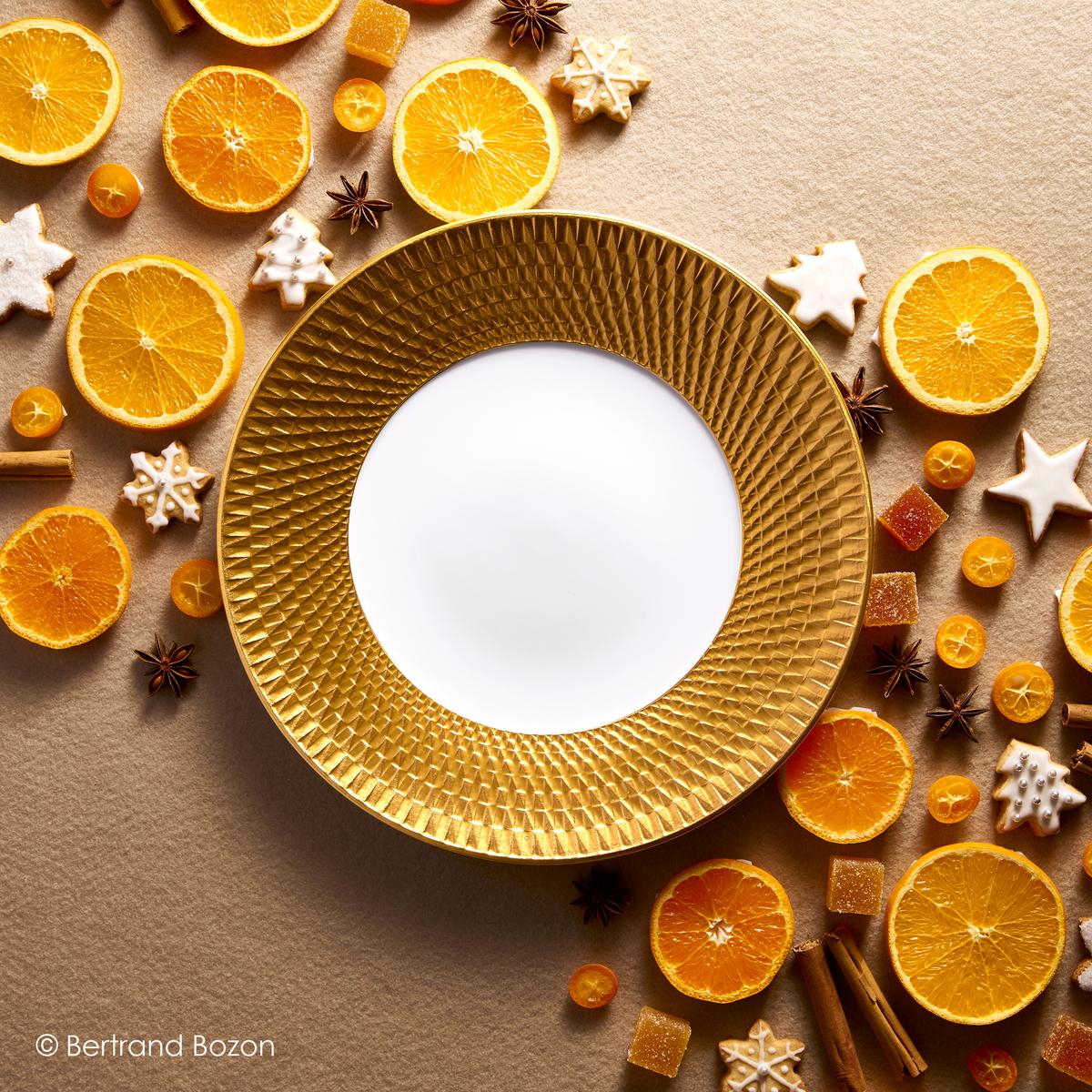 "Twist Gold" by Bernardaud adds exciting golden highlights to your table, especially in combination with the white "Twist" dinner service. However, "Twist Gold" can just as well shine on your table alone by itself. Engraved on the rim of the plates and on the outside of the various pieces of the collection, it is the light that reveals the alternation of matt and shining rendering.