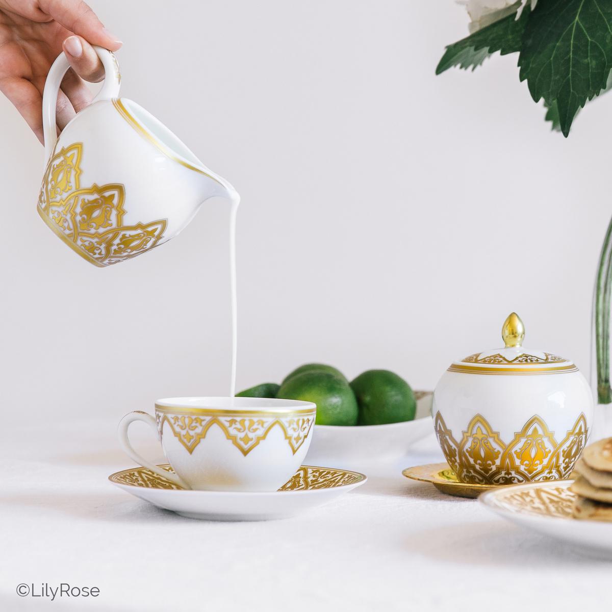The decoration of the "Venise" dinnerware by Bernardaud could well have been inspired by the city palaces of the cosmopolitan Italian city of Venice. The golden refinement and the broad, gold-decorated edges, give the items of the service a highly sophisticated and majestic appearance. This "Venise" table service is made of the finest Limoges porcelain and is produced in the established and traditional Bernaudaud porcelain factory.