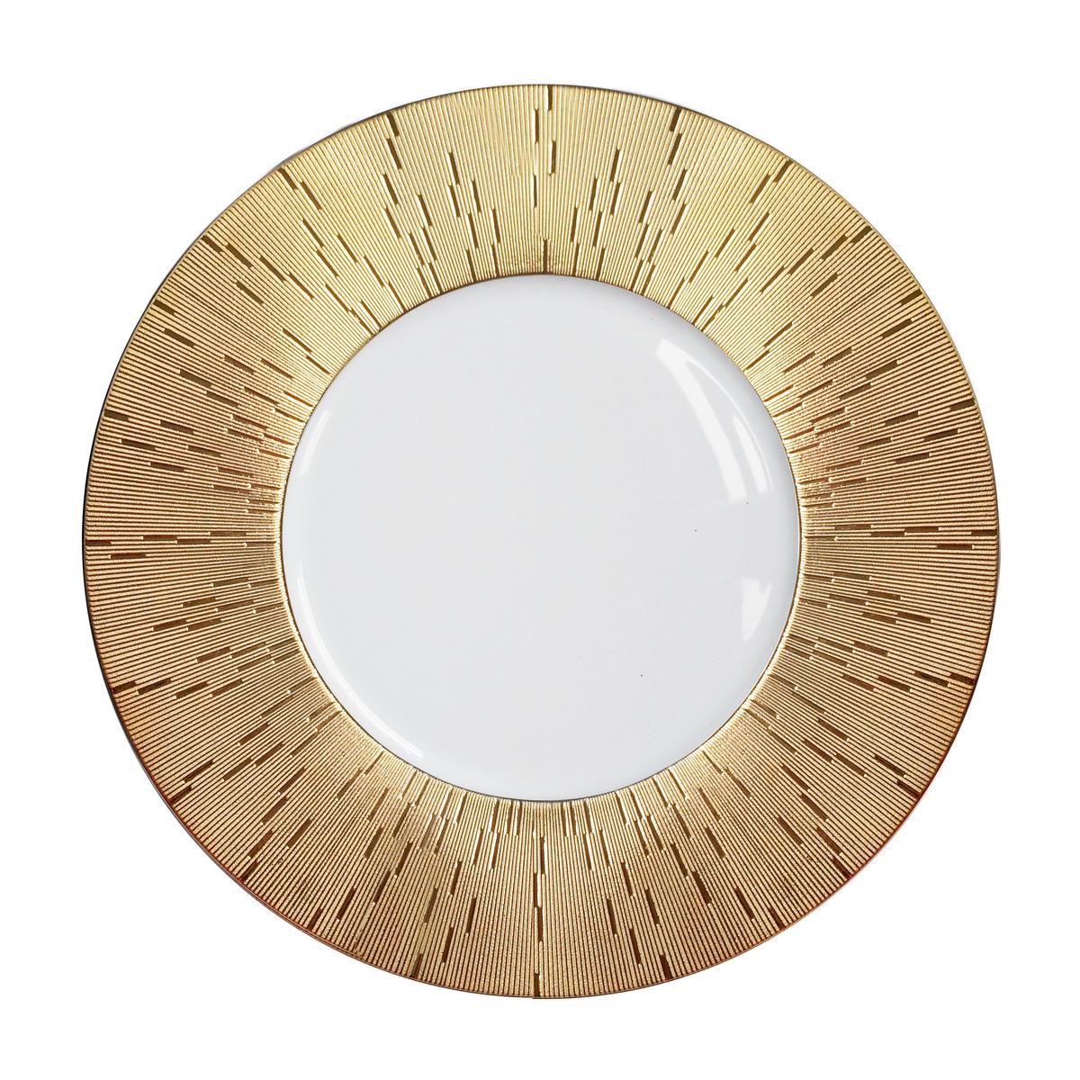 Limoges porcelain from Haviland stands for perfect craftsmanship, and you will find it impossible to resist running your fingers over this gorgeous "Infini" dinnerware line. All of the "Infini" plates by Haviland have a radial relief pattern, which is "engraved" into the Limoges porcelain. Precious gold refinement on the rim of the plates add a distinctive air of sophistication to this exclusive porcelain making it particularly eye-catching. Each plate from Haviland is a unique piece, exclusively shaped and worked by hand.