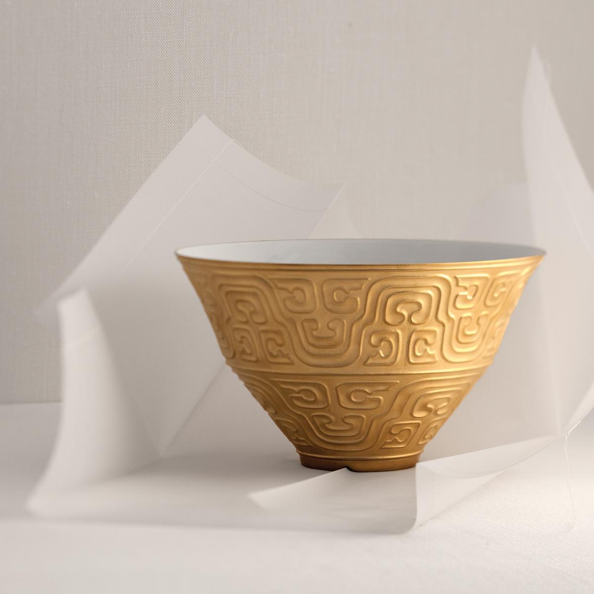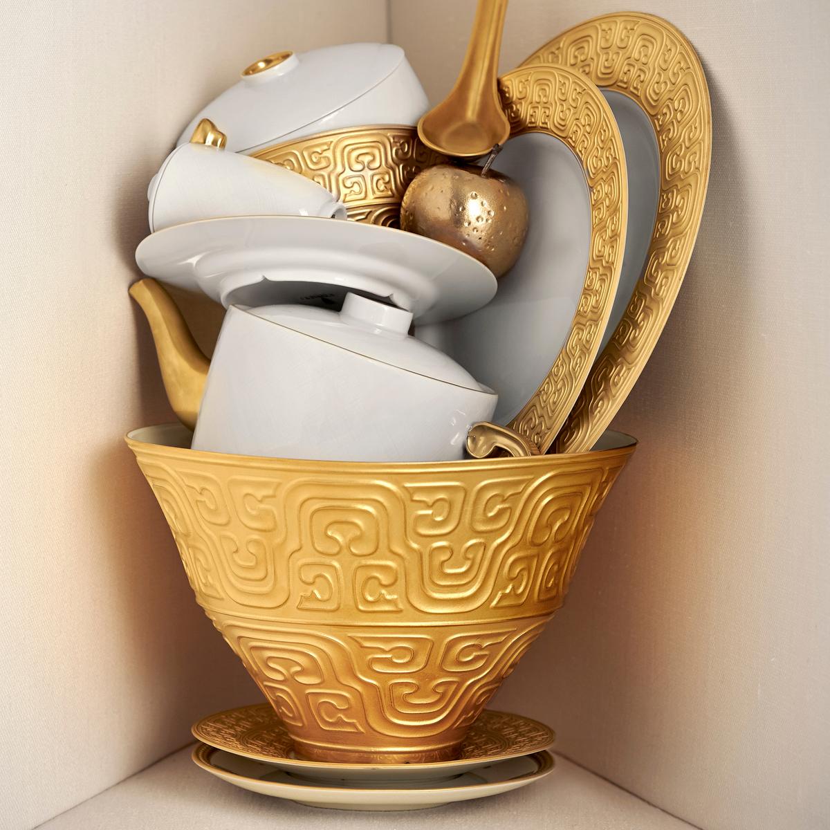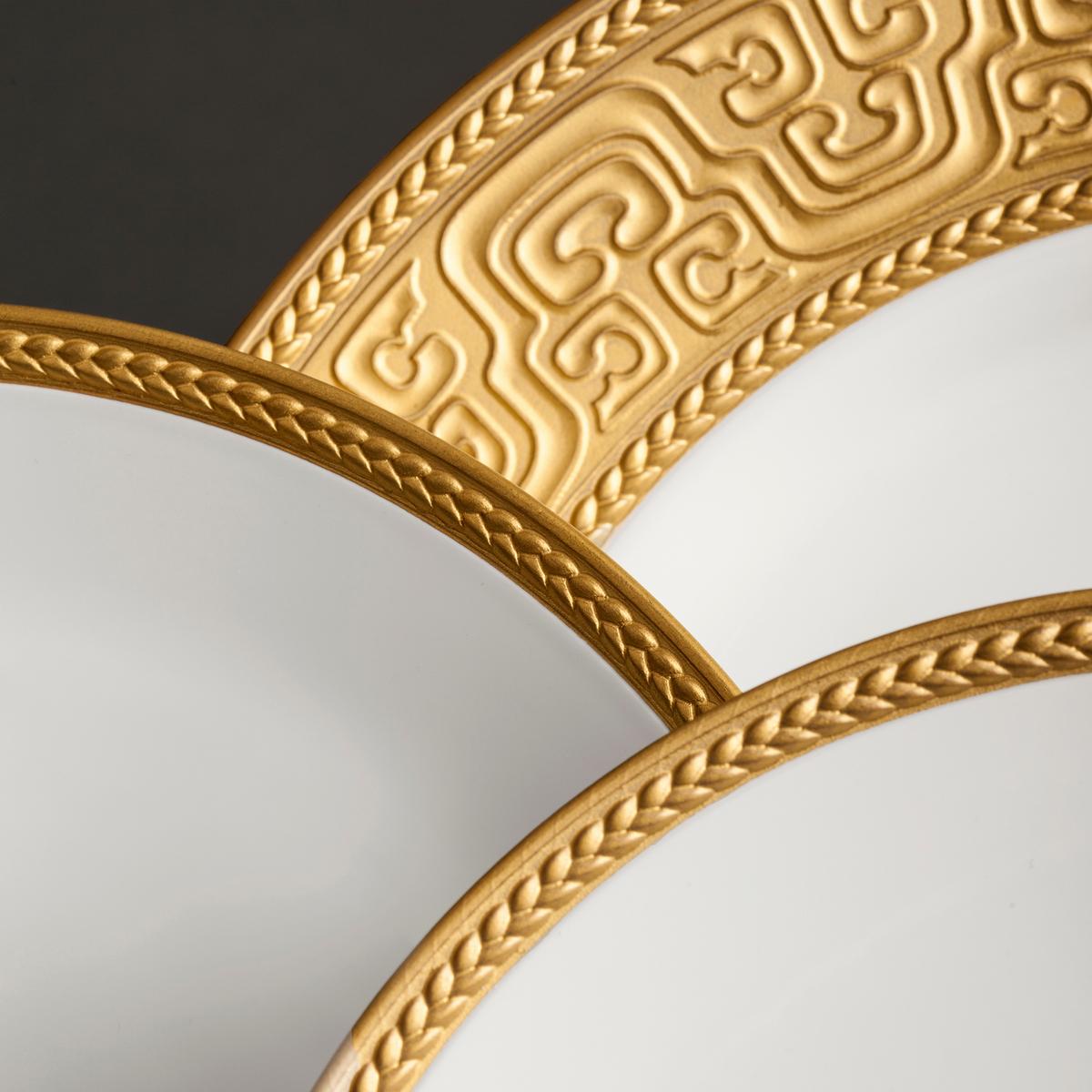 The fine porcelain of the "Han Gold" dinnerware by L'Objet is decorated with artistic golden relief structures. The inspiration for this opulent "Han Gold" dinner service takes us way back to what is nowadays known as the Chinese Han dynasty. The pronounced relief structures around the edges of the plates and dishes goes back to this era that achieved international renown for its magnificent productions in the arts and crafts.
