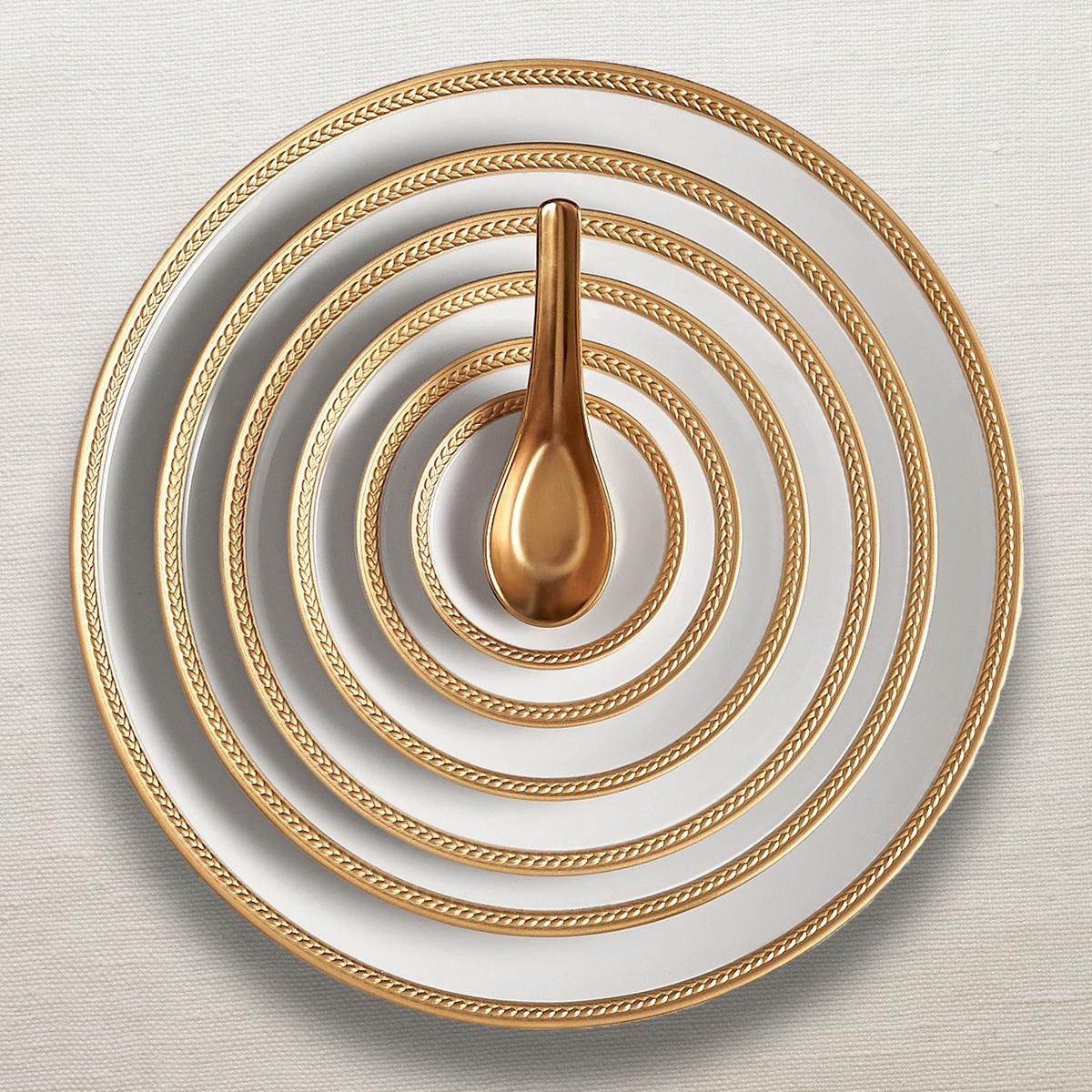 The decoration of the "Soie Tressée" dinner service from L’Objet takes advantage of an age-old design: the classic braid pattern (Soie Tressée = braided silk). L’Objet has successfully translated this ancient pattern into a modern, relief element in its "Soie Tressée" service. The golden braided pattern (24 carat gold) adorns the rims of this elegant "Soie Tressée Gold" service, which is made of fine porcelain.