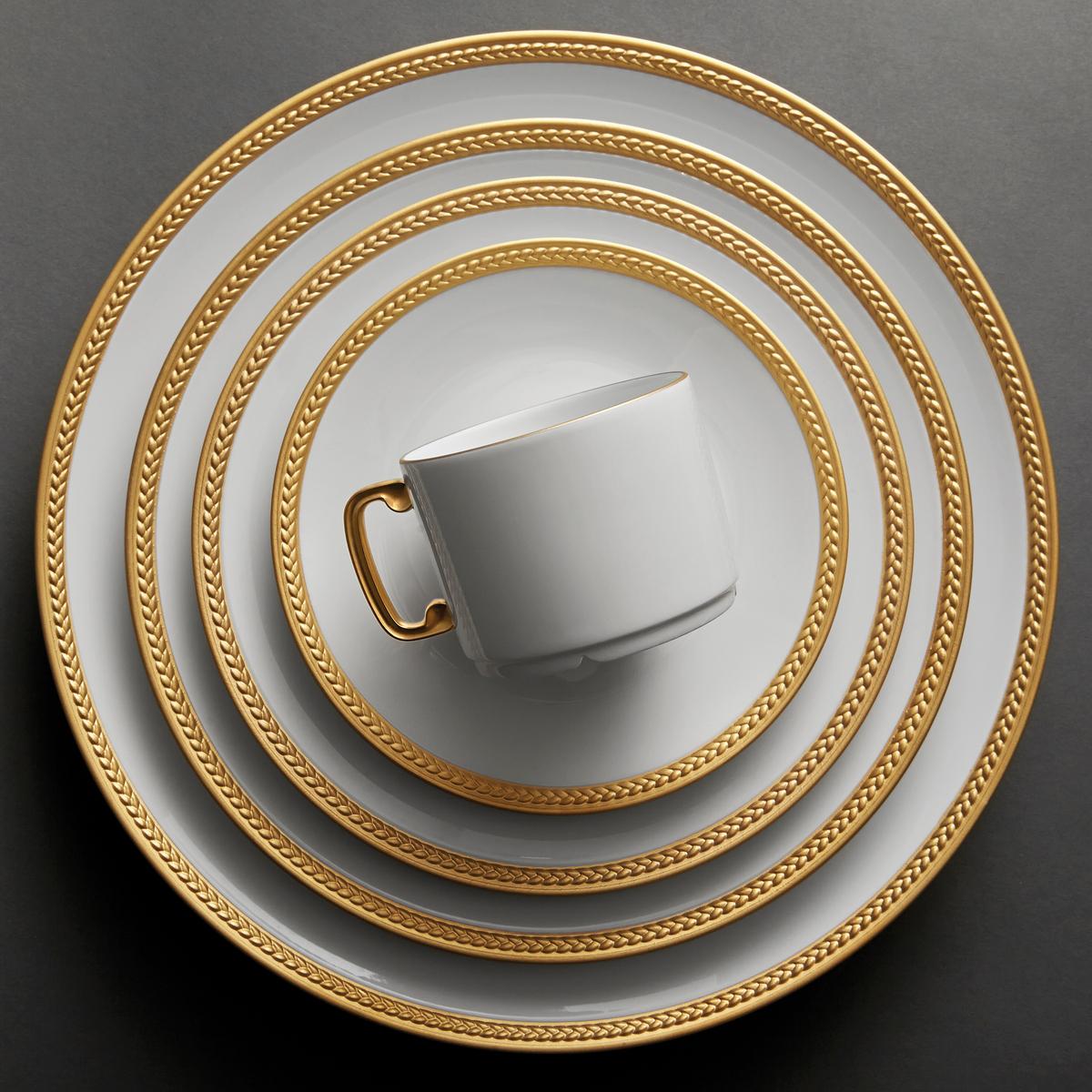 "Soie Tressée Gold" can be combined wonderfully not only with the "Soie Tressée White" but also with L’Objet’s "Han Gold" dinner service, too. This combination in particular produces an enchantingly beautiful effect on your dining table.