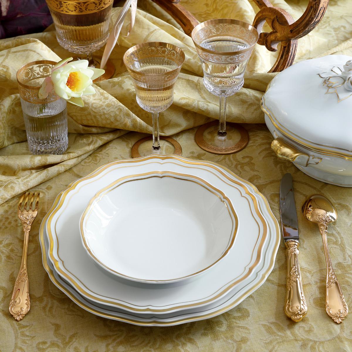 The "Polka Gold" dinnerware by Raynaud gleams in the famous white of Limoges porcelain. In itself, the porcelain with the fine gold rim is quite sleek and simple. The dinner service is framed with two rims in shiny gold. The double curved golden rim is applied by hand. This beautiful dinnerware line is designed to last. It can be wonderfully mixed or extended with other services by Raynaud. As you can see in the pictures "Polka Gold" was combined with "Aura" by Raynaud.