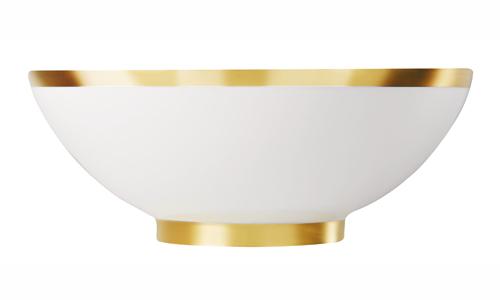 The pure gold highlights the luxurious appearance of the white porcelain and demonstrates its purity in a way that was not obvious until now. Each piece of the dinner service has its own unique appearance: either by providing a flat, mirror-like surface or adding a line around the rim, the decoration enhances the special character and shape of each individual item.