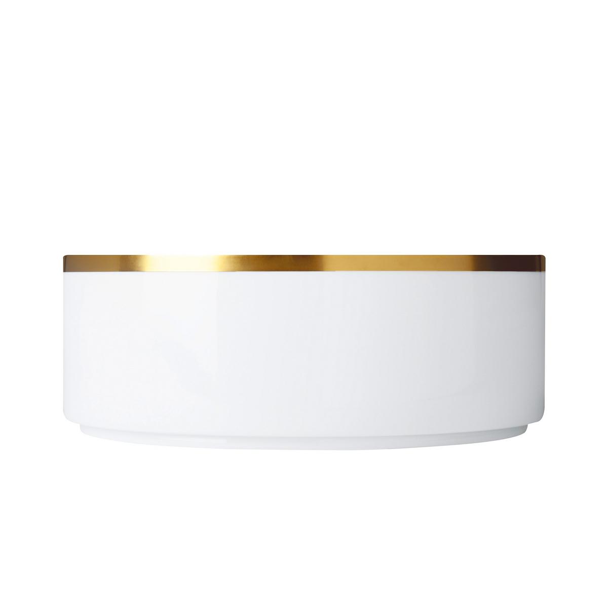 The pure gold highlights the luxurious appearance of the white porcelain and demonstrates its purity in a way that was not obvious until now. Each piece of the dinner service has its own unique appearance: either by providing a flat, mirror-like surface or adding a line around the rim, the decoration enhances the special character and shape of each individual item.