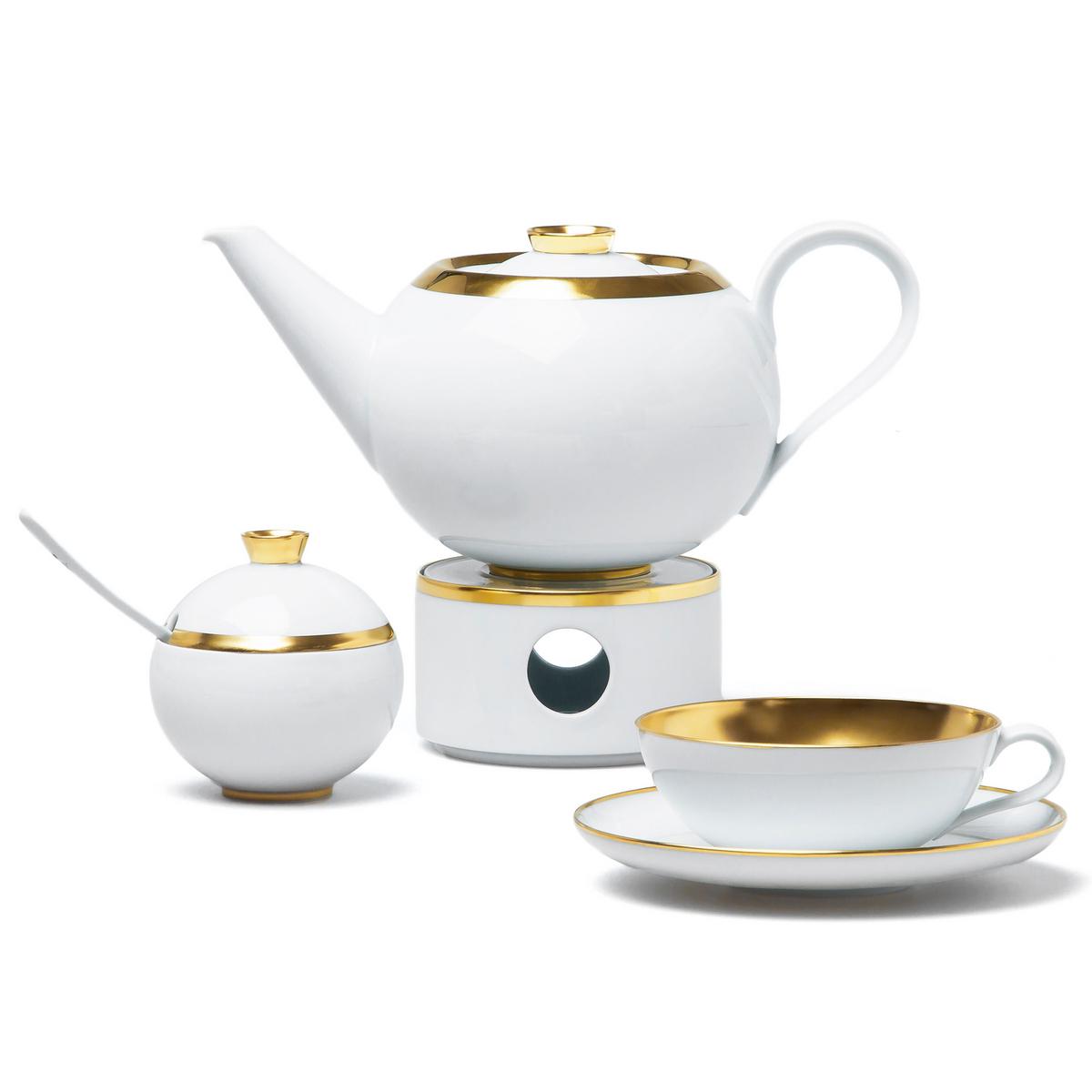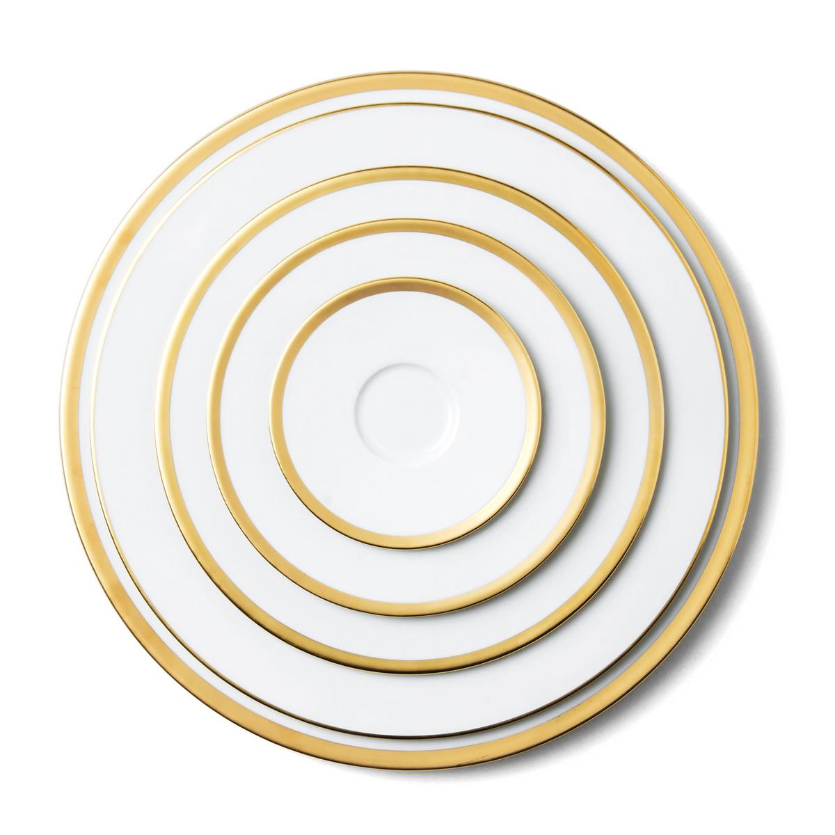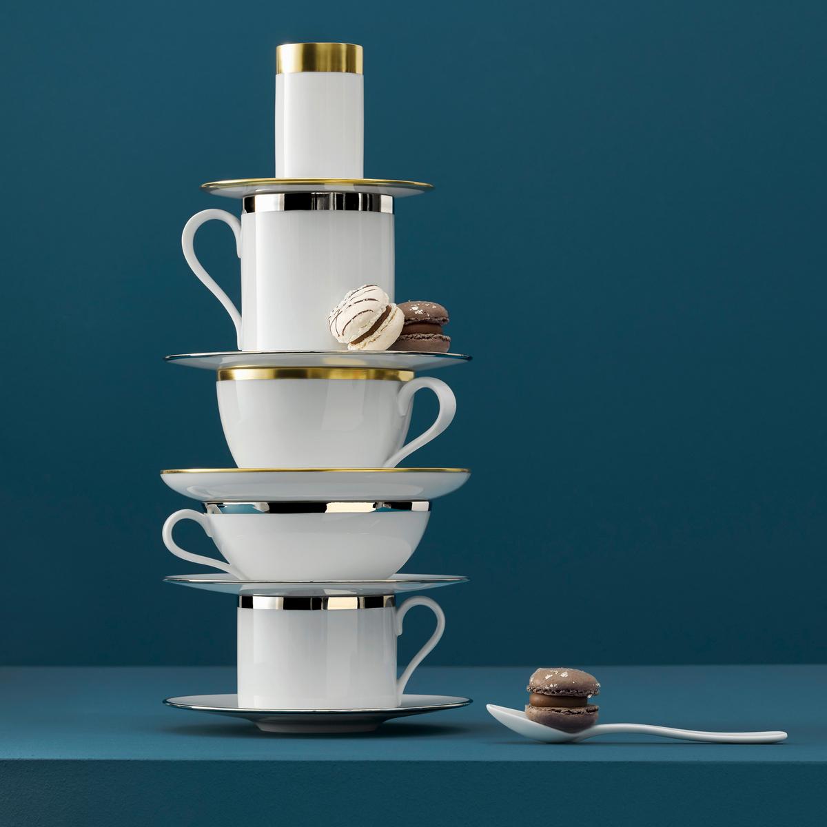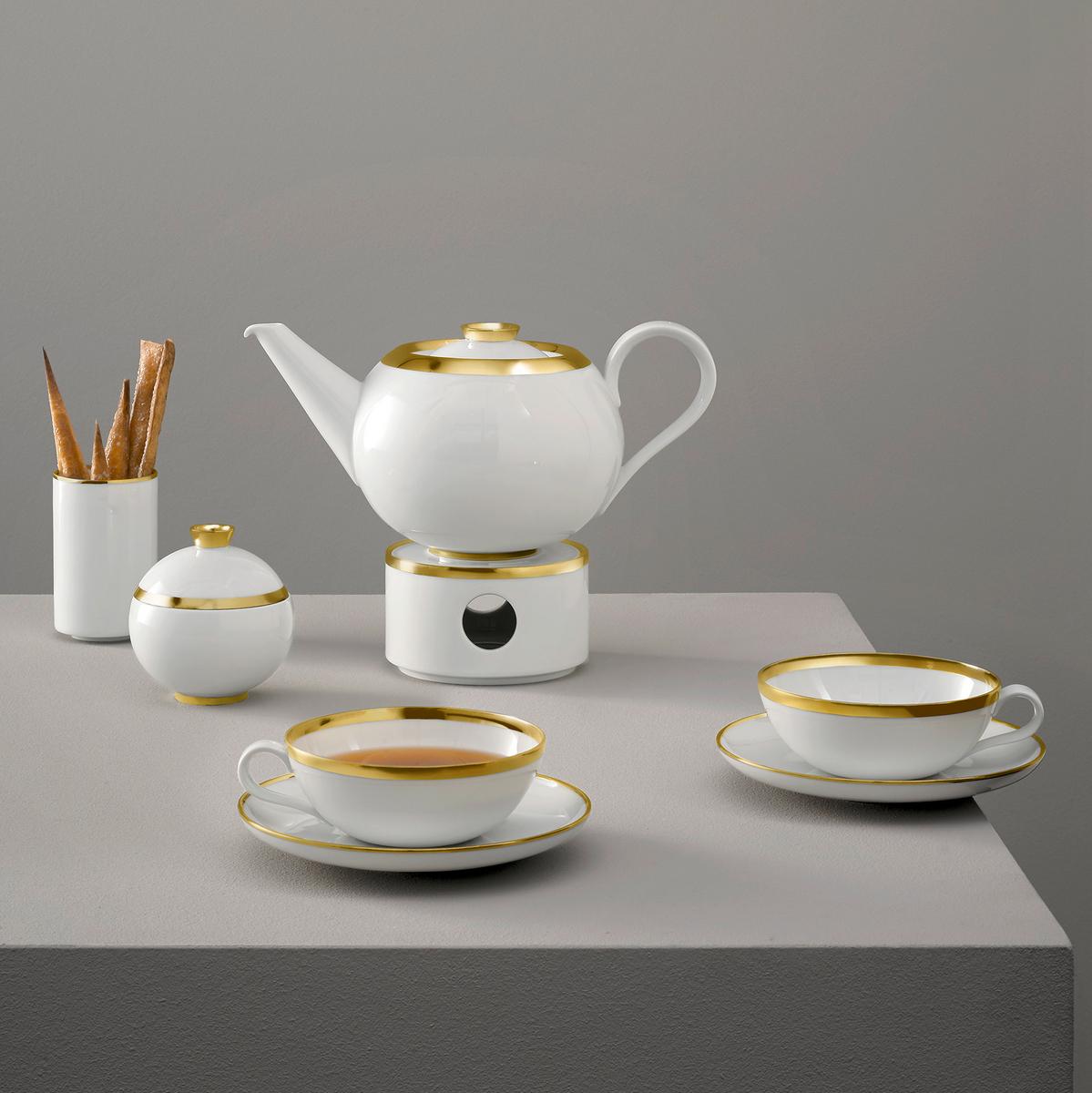 The pure gold highlights the luxurious appearance of the white porcelain and demonstrates its purity in a way that was not obvious until now. Each piece of the dinner service has its own unique appearance: either by providing a flat, mirror-like surface or adding a line around the rim, the decoration enhances the special character and shape of each individual item.