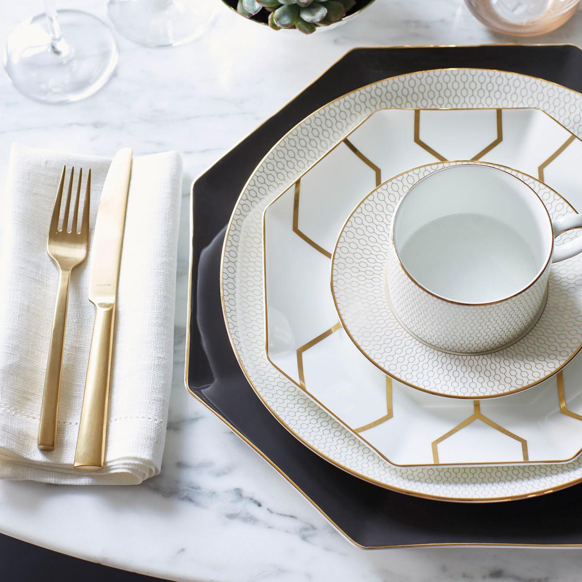There is a refined interplay of colours and different designs with octagonal and round plates. The tea and espresso cups are each available in five different designs. The "Arris - Gio Gold" service from Wedgwood is thus an invitation to a colourful "mix and match".