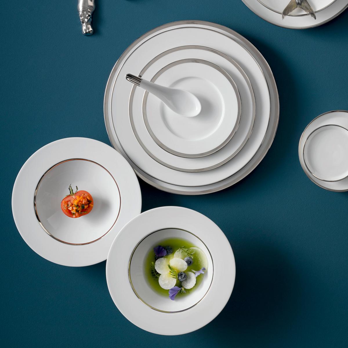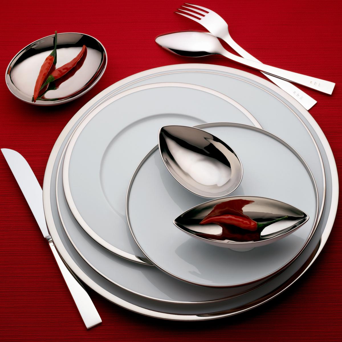 Each piece of the dinner service has its own unique appearance: either by providing a flat, mirror-like surface or adding a line around the rim, the decoration enhances the special character and shape of each individual item.
