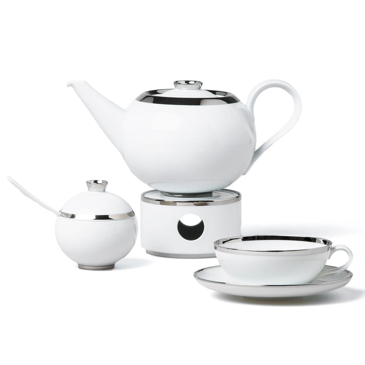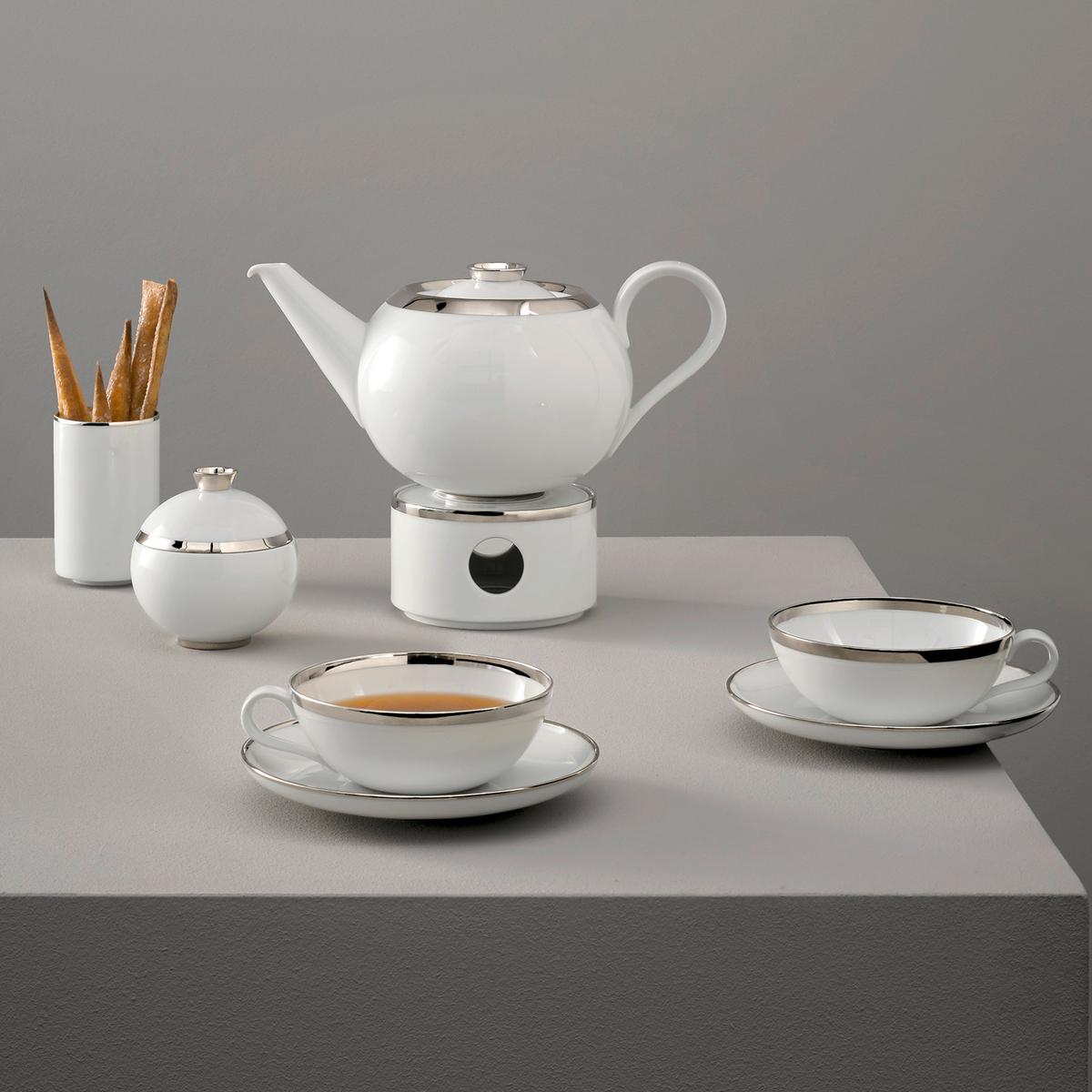 In order to demonstrate this extraordinary elegance at its best, some of the pieces are lavishly decorated with platinum. There is even a completely platinum-plated version of the teapot.