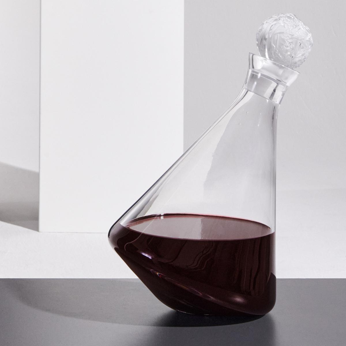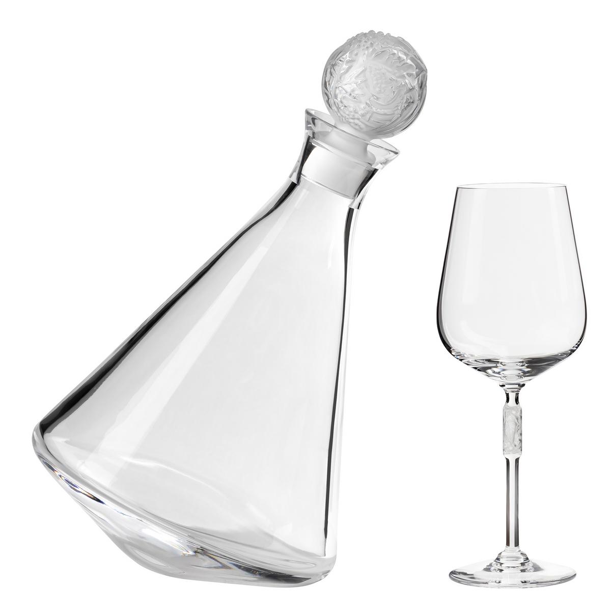 The decanter is an invitation to experience the pleasures of discovery and tasting. The vine motif also adorns the stopper of the decanter. As if weightless, the decanter sways with movement in a beautiful dance. With a shape studied for all types of wine, the glass is distinguished by the "Merles & Raisins" motif carved as a medallion in satin-finished crystal, emblematic of Lalique.