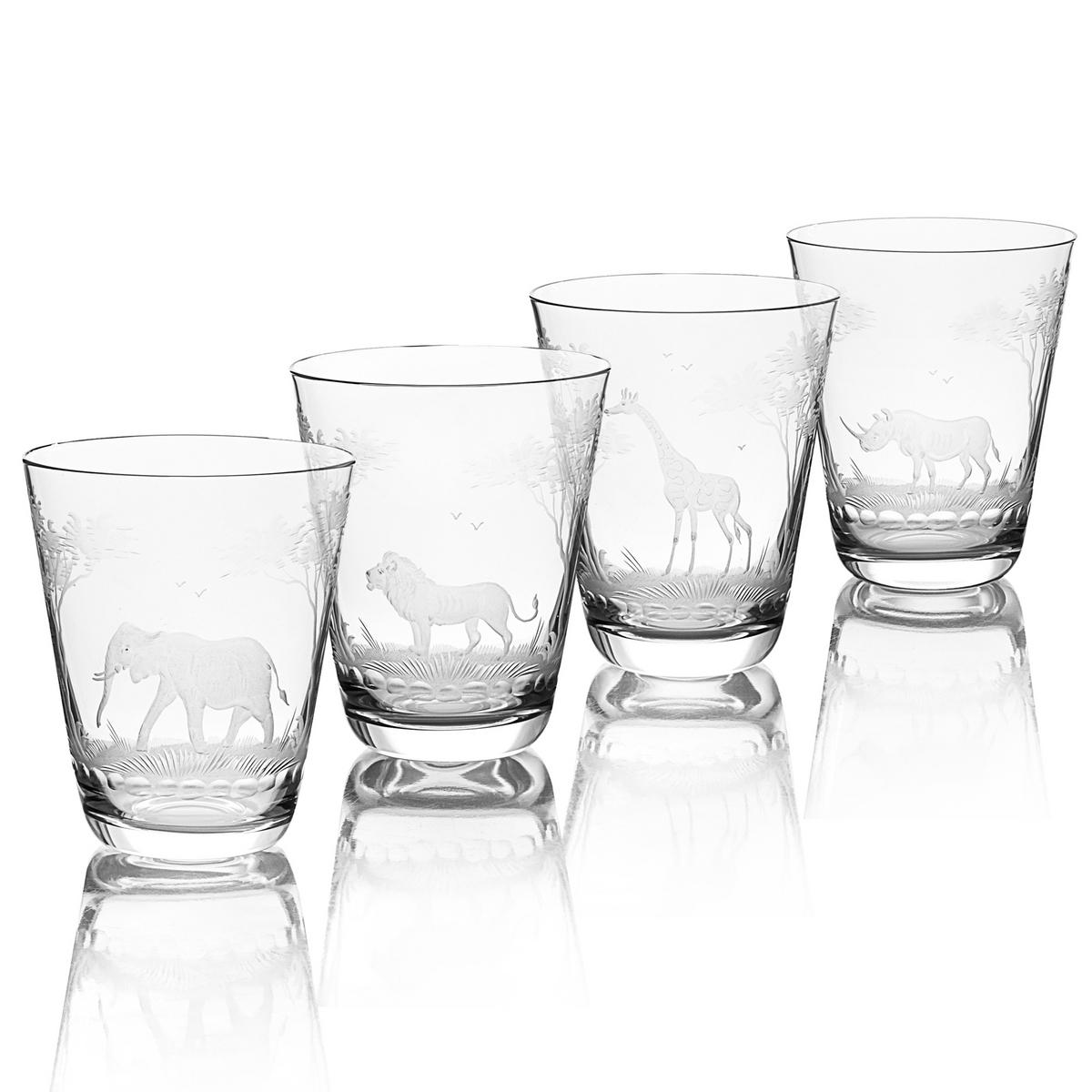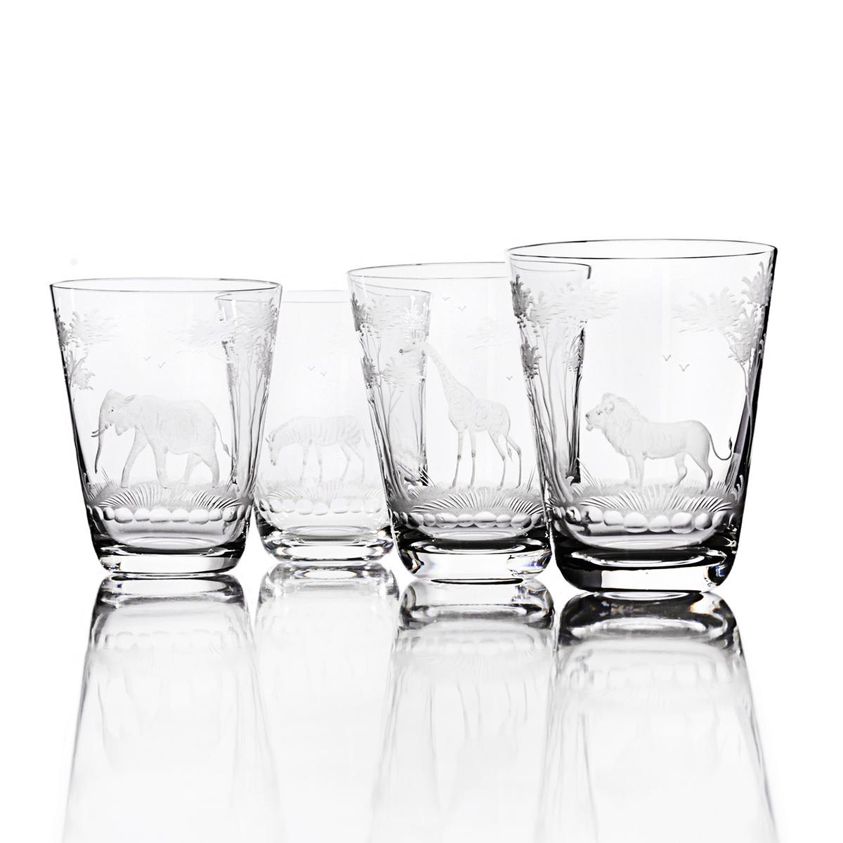 These "Kilimandjaro" tumblers and carafe by Theresienthal are small masterpieces of crystal glass. They are mouthblown and engraved by hand. The engraver cuts the precise images into the glass, cut by cut. With a skilled hand, he works fine shades into the pictures - making the animals and landscape appear particularly vivid and alive.