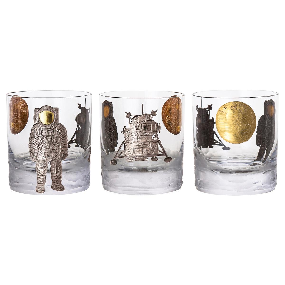 Named for the Cold War era of competition between the USA and USSR over spaceflight capability, the "Space Race" glass collection by Artel is comprised of two separate motifs: "Sputnik" features an image of the famous Soviet satellite in flight, careening past glittering gold stars and planets, while "Apollo 11" depicts a space-suited American astronaut standing near a lunar landing module with a magnificent earthrise looming in the background.